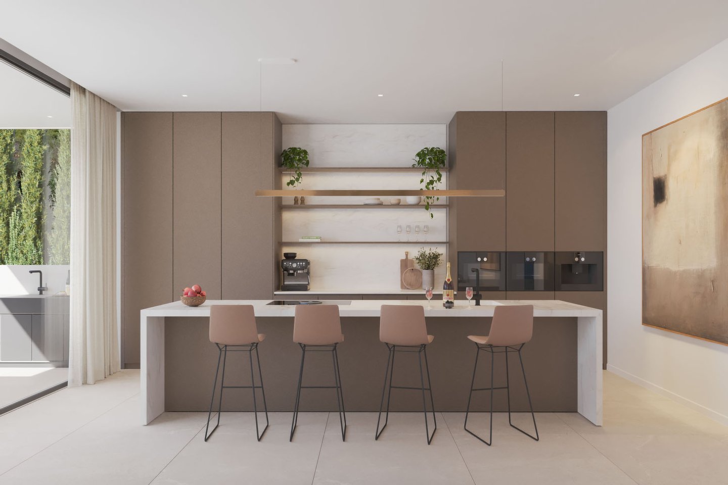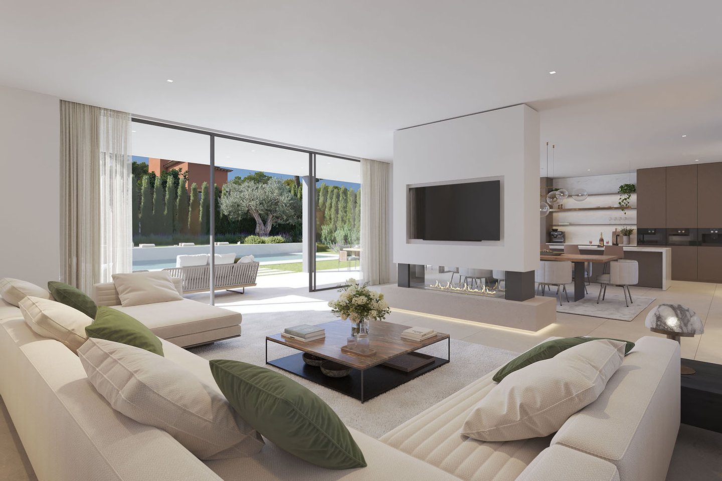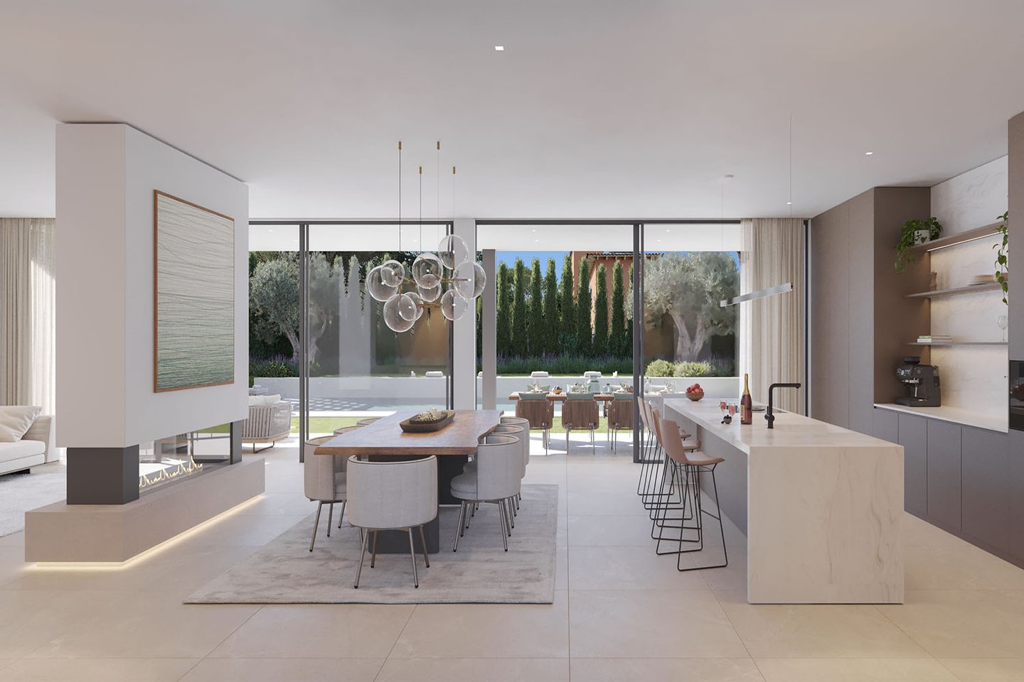 Die Immobilie erstreckt sich über drei Ebenen und beeindruckt durch ihre klare, zeitgemäße Architektur mit eleganten Fassaden und großzügigen Fensterflächen. Im Inneren entsteht ein offenes, lichtdurchflutetes Wohnkonzept, bei dem Wohn-, Ess- und Küchenbereich harmonisch ineinander übergehen. Eine Designerküche mit Markengeräten fügt sich dabei nahtlos in das moderne Gesamtbild ein und erfüllt höchste Ansprüche an Funktionalität und Ästhetik. Hochwertige Materialien wie edle Natursteinböden und warme Parkettflächen unterstreichen den luxuriösen Charakter und schaffen eine angenehme Wohnatmosphäre. Große Schiebetüren öffnen den Wohnbereich nahtlos zur überdachten Terrasse und dem Garten mit Salzwasserpool.