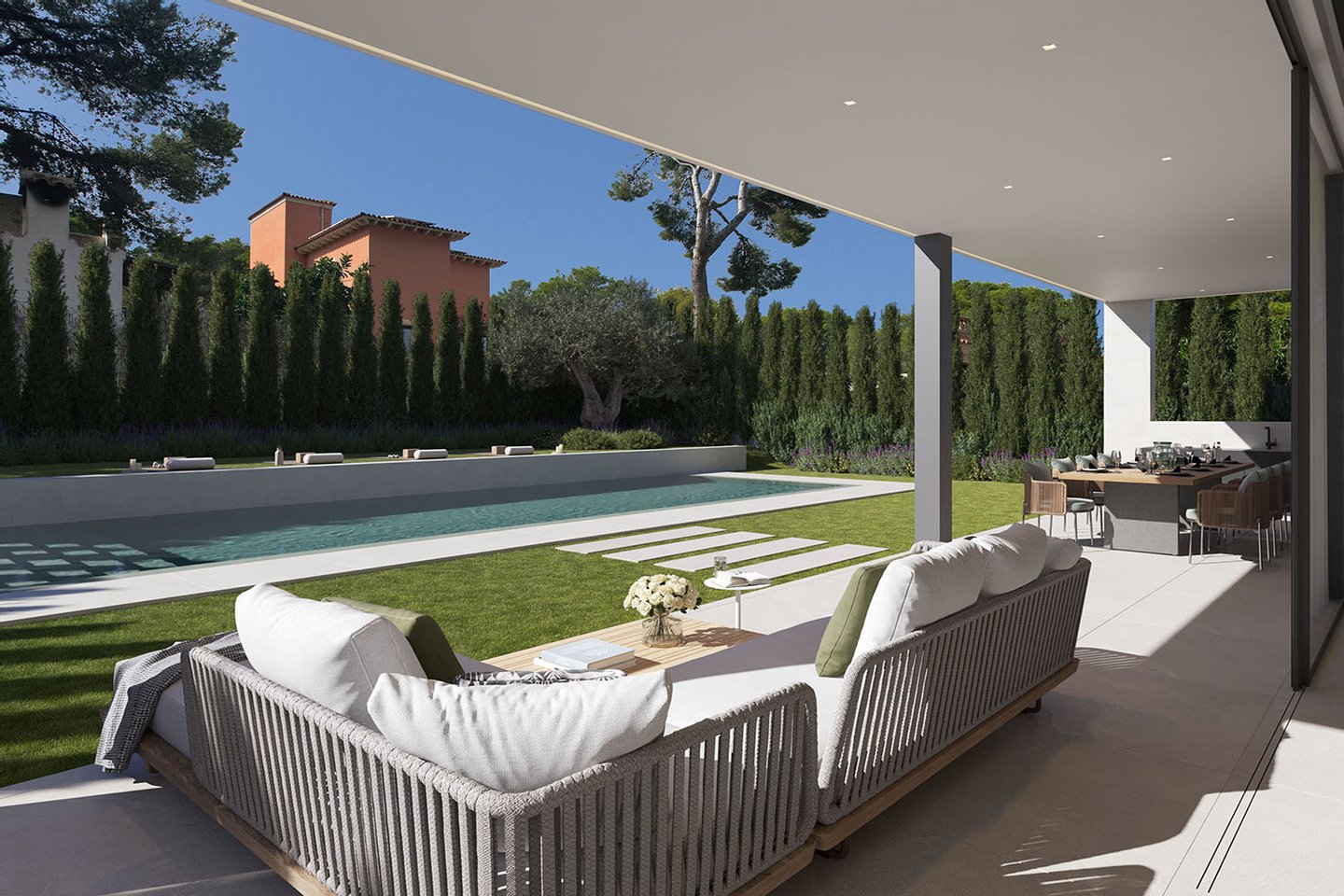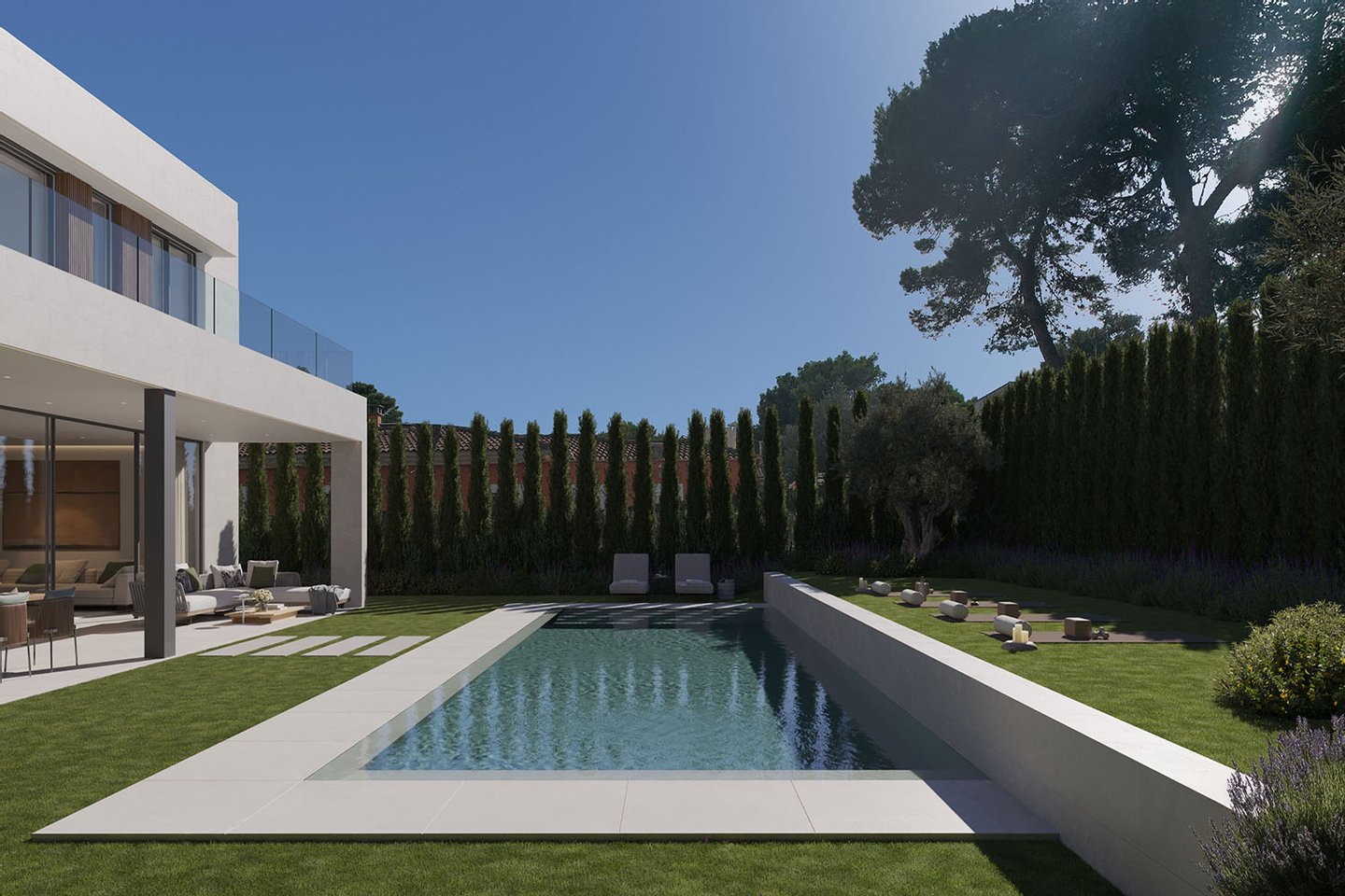 Auch die Außenbereiche überzeugen durch ihre durchdachte Gestaltung: Sonnige Terrassen, ein moderner Poolbereich und gepflegte Grünflächen schaffen eine private Wohlfühloase. Die ruhige Umgebung und die mediterrane Vegetation verleihen dem Anwesen eine besondere Atmosphäre.