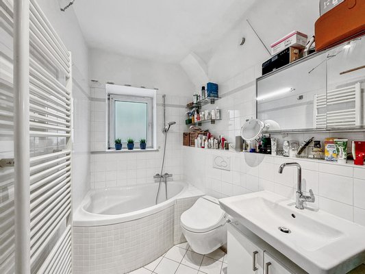 Die helle Wohnküche bietet ausreichend Platz für eine kleine Essecke und ist mit einer Einbauküche ausgestattet. Ein Fenster sorgt für Tageslicht und eine freundliche Wohnatmosphäre. Das modern gestaltete Tageslichtbad ist hell und ansprechend ausgestattet und verfügt über eine Badewanne, ein Waschbecken, ein WC, einen Handtuchheizkörper sowie einen Waschmaschinenanschluss.