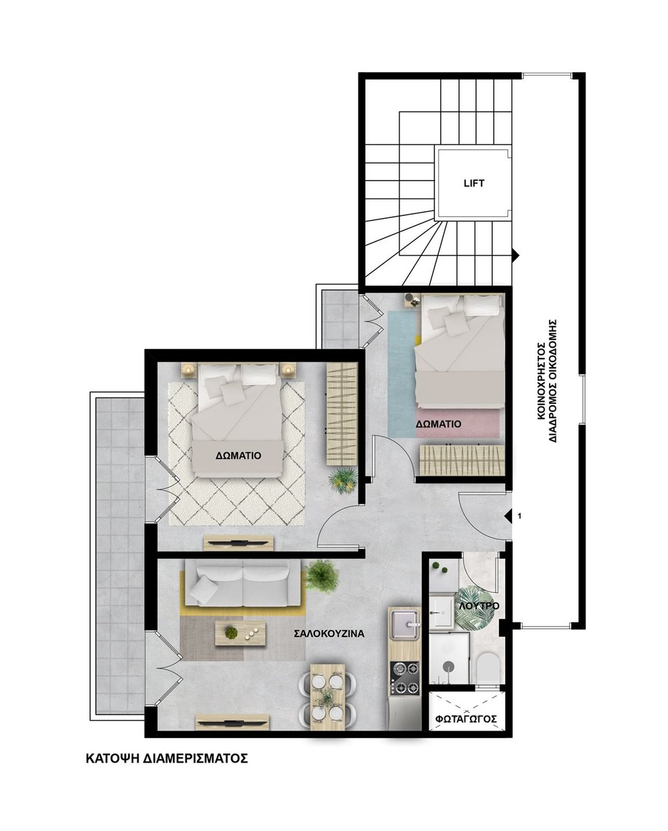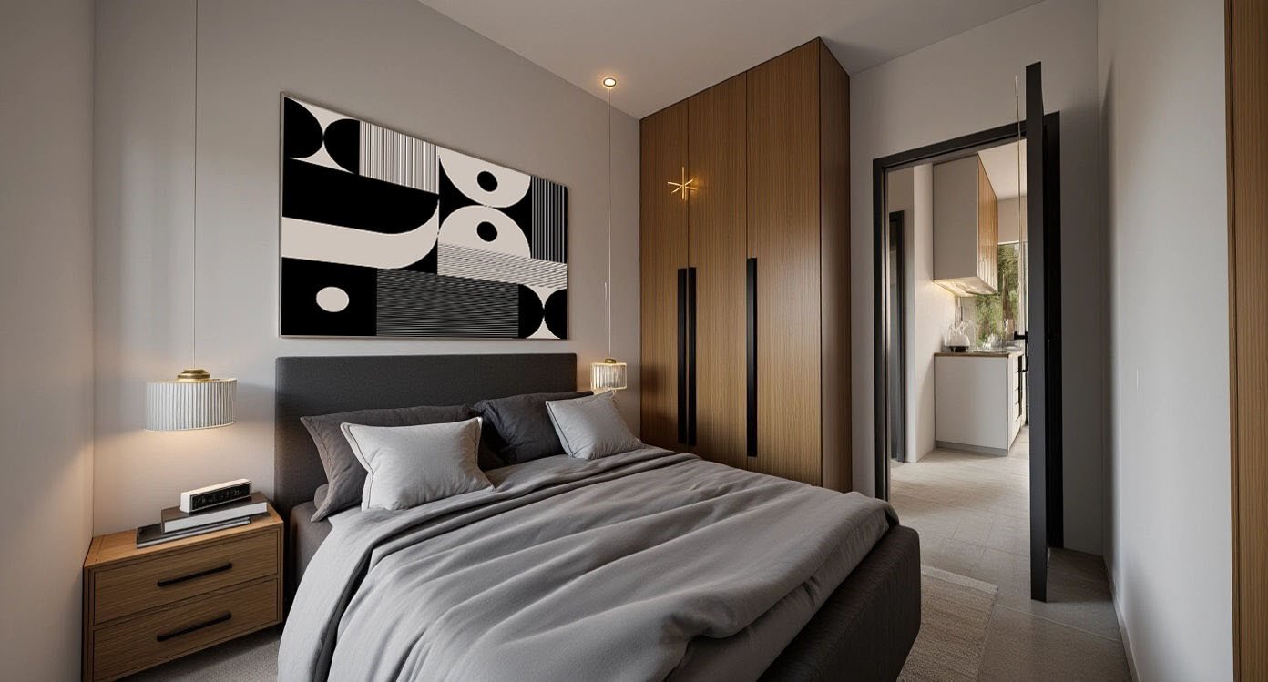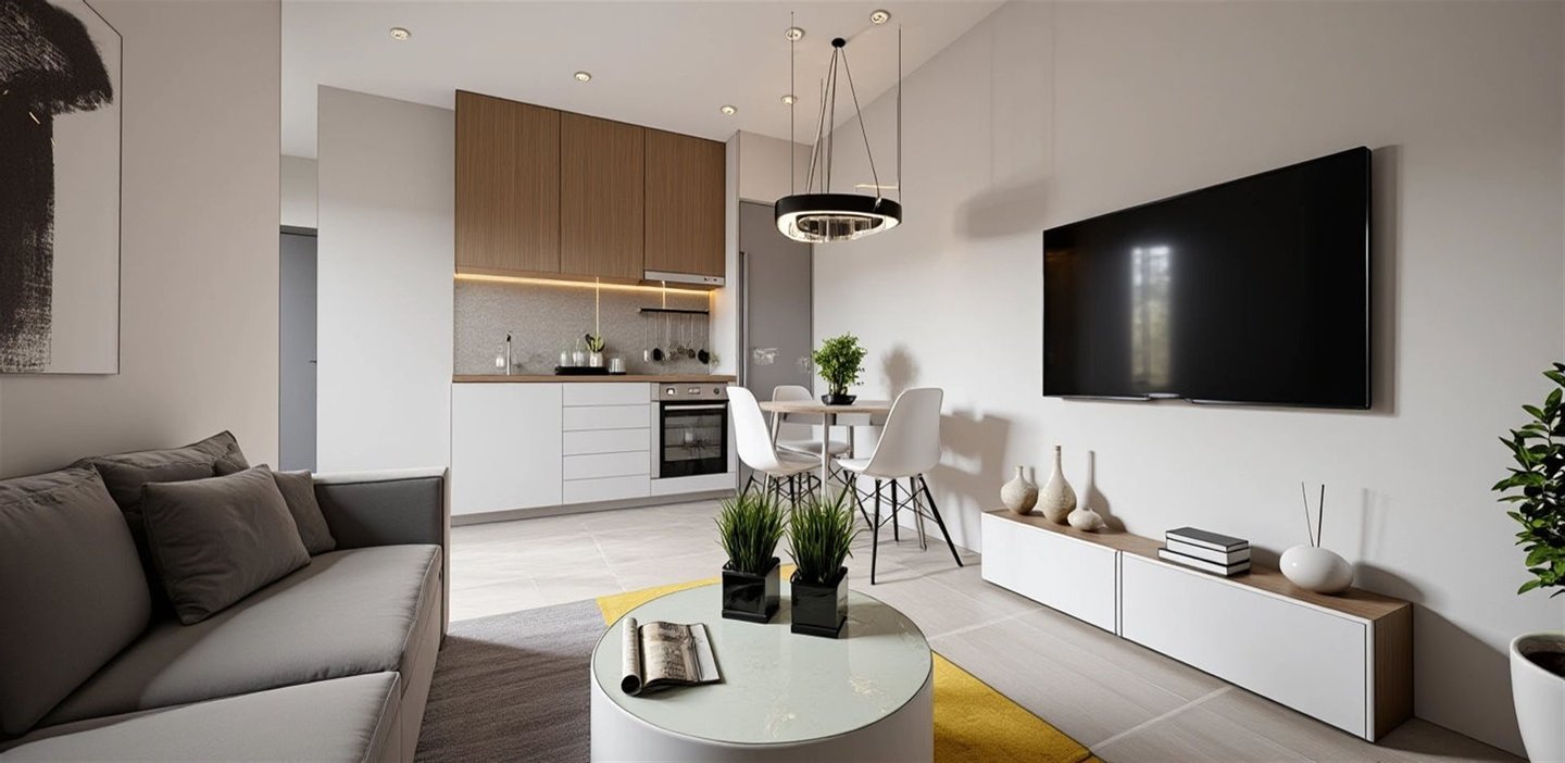 Sie besteht aus einem offenen Wohn-Ess-Küchenbereich, der ideal den Alltag bedient, zwei geräumigen Schlafzimmern und einem modernen Badezimmer und bietet eine funktionale und bequeme Raumaufteilung.