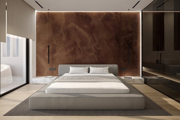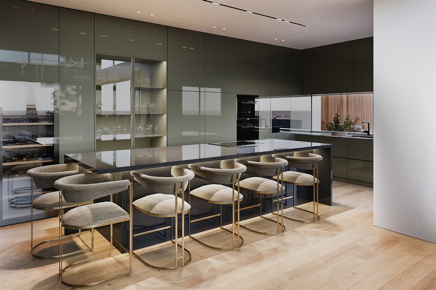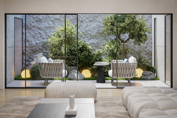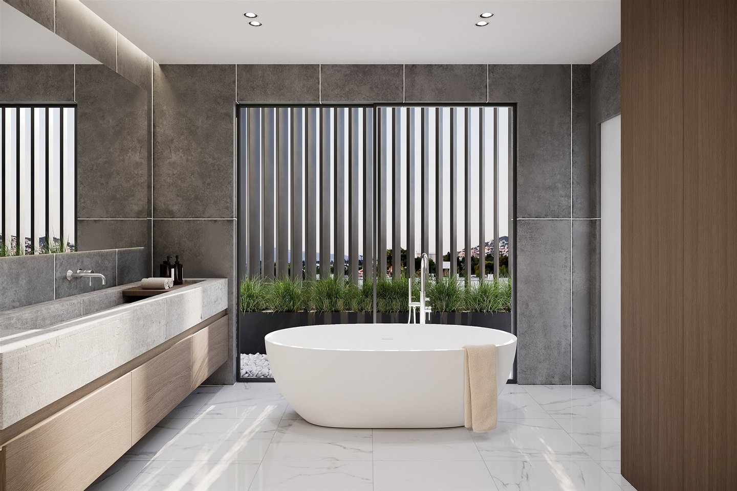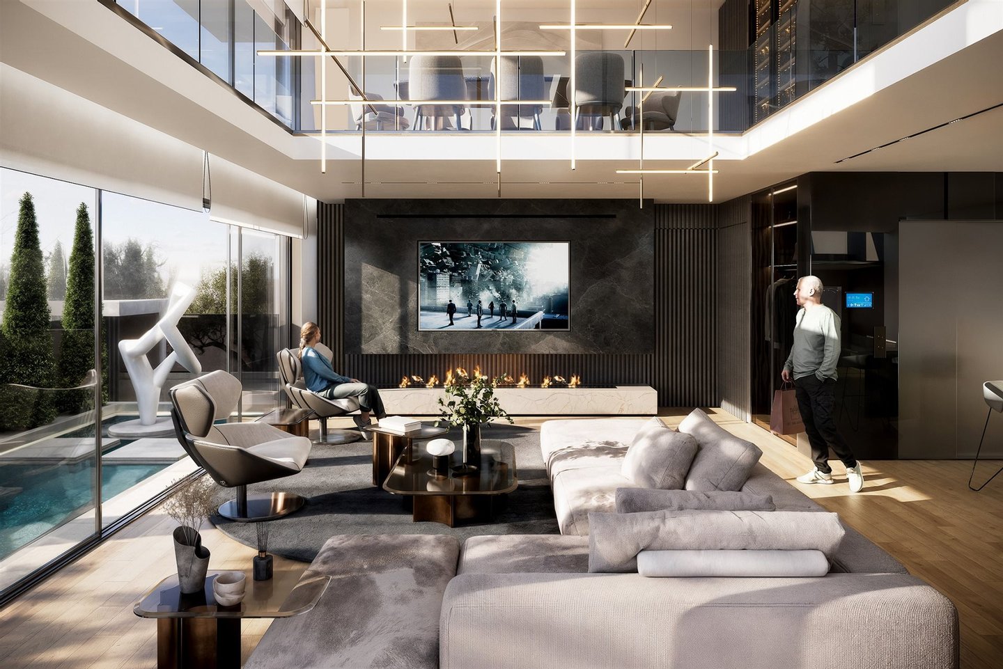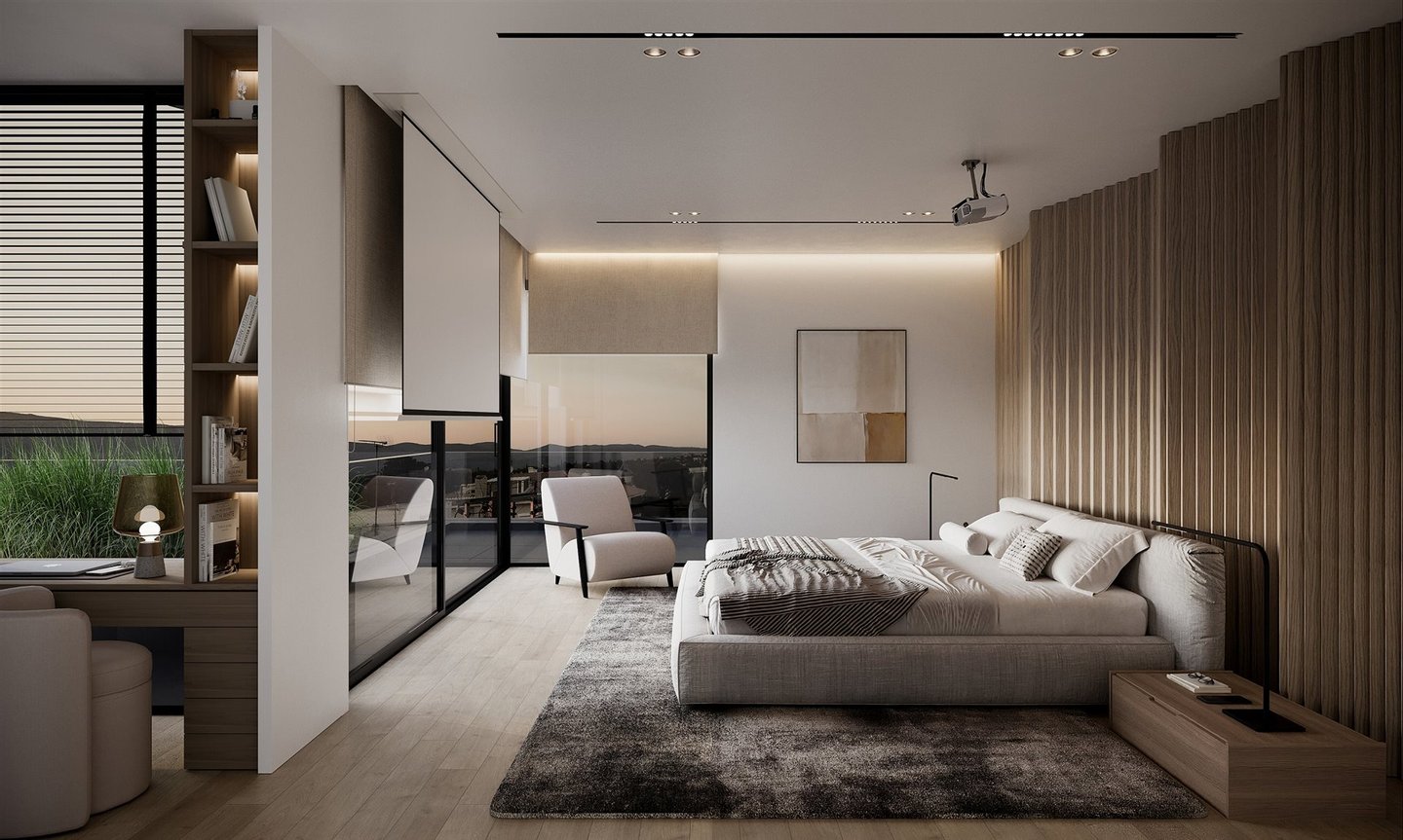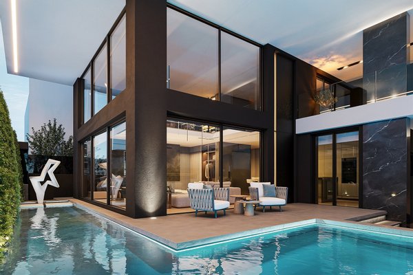 Im Erdgeschoss gibt es ein beeindruckendes Wohnzimmer mit doppelter Raumhöhe und Kamin, eine offene Küche, ein WC und große Öffnungen mit direktem Zugang zum Pool.