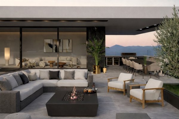 Der gepflegte Außenbereich bietet einen Infinity-Pool und Sitzgelegenheiten.