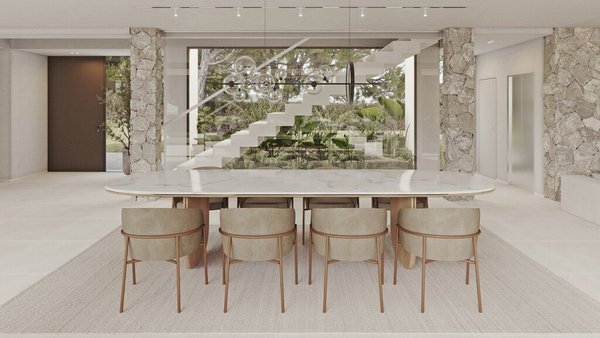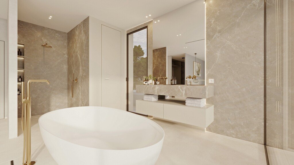 Die Villa verfügt über vier Schlafzimmer und vier Badezimmer sowie ein Gäste-WC, die alle mit Blick auf Komfort und Funktionalität gestaltet wurden. Natursteinböden ziehen sich durch das gesamte Haus, während die maßgefertigte Küche vollständig mit hochwertigen Miele-Geräten ausgestattet ist.
