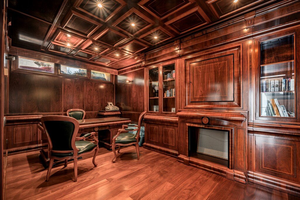 Das geräumige Haus umfasst fünf Schlafzimmer, vier Badezimmer und ein Arbeitszimmer, verteilt auf etwa 500 m² Wohnfläche auf einem großzügigen Grundstück von 1.830 m². Die privilegierte Lage direkt am Wasser erhöht die Attraktivität und bietet atemberaubende Panoramablicke, die das Anwesen besonders machen.