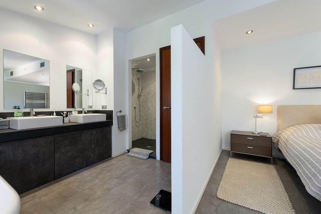 Im Obergeschoss bieten zwei sehr geräumige Schlafzimmer Privatsphäre und Eleganz. Die Gästesuite verfügt über Einbauschränke und ein modernes eigenes Badezimmer. Die Master-Suite bietet einen luxuriösen Rückzugsort mit einer freistehenden Badewanne, einer separaten Dusche und Zugang zu einer sonnigen Terrasse mit Außendusche – perfekt, um das Klima Mallorcas zu genießen.