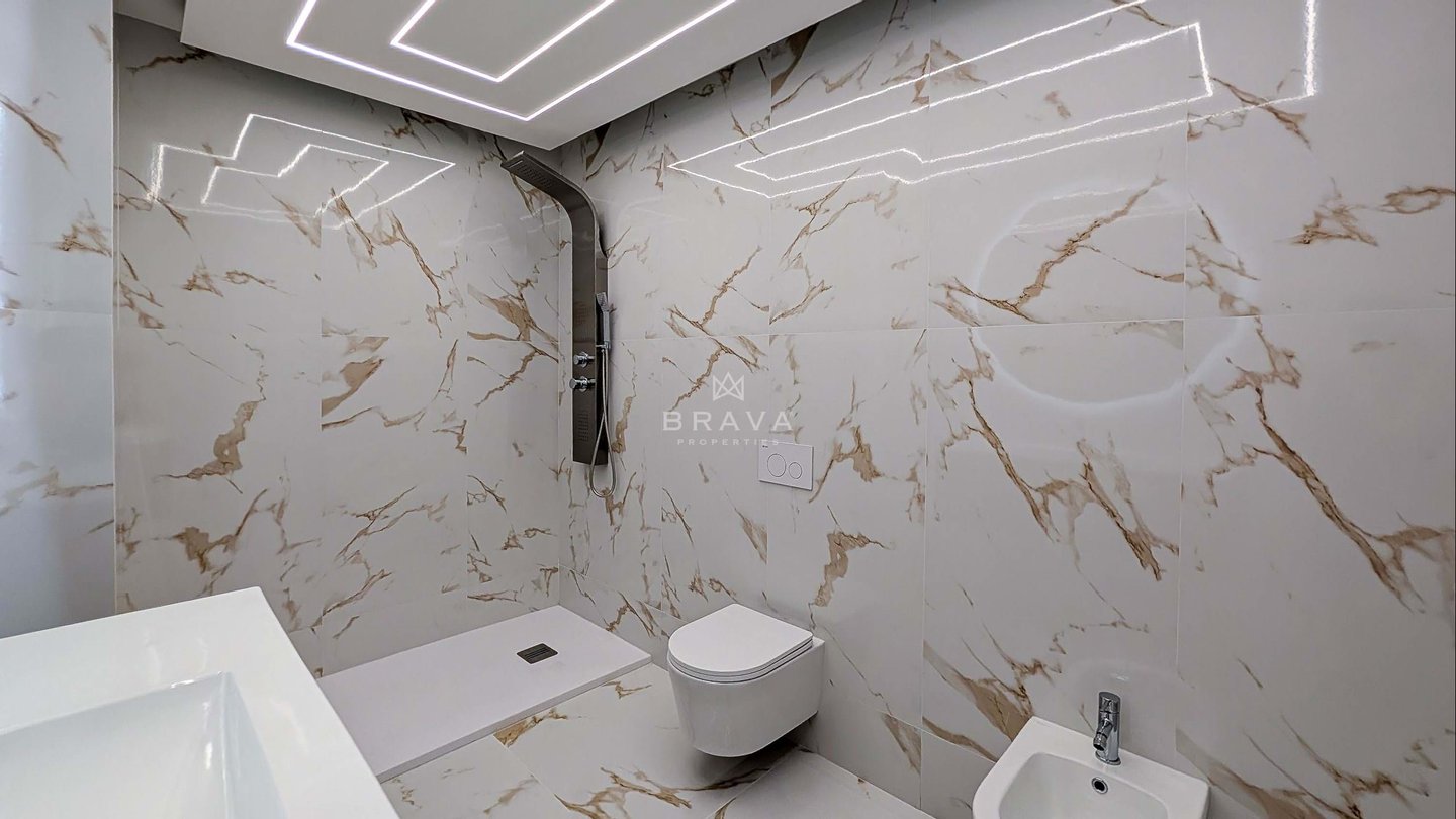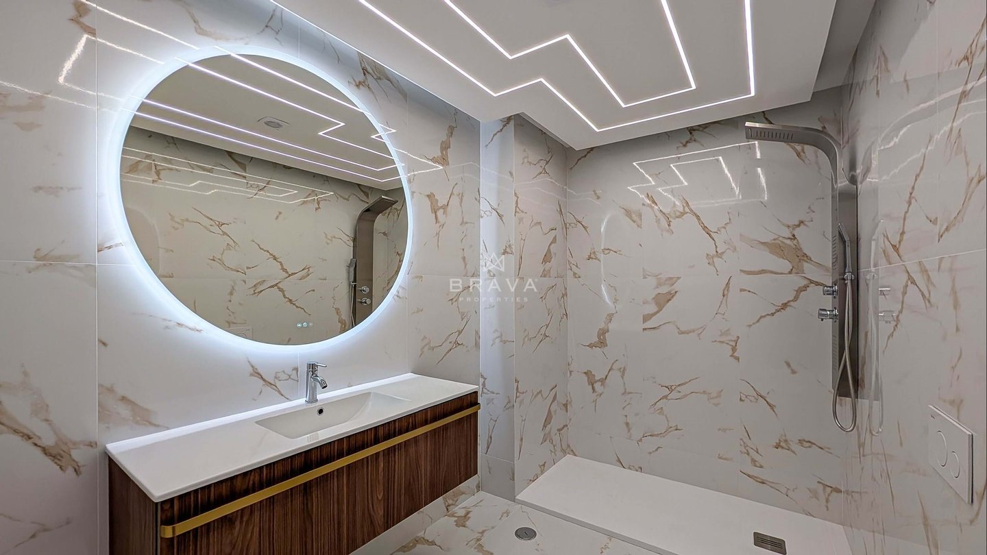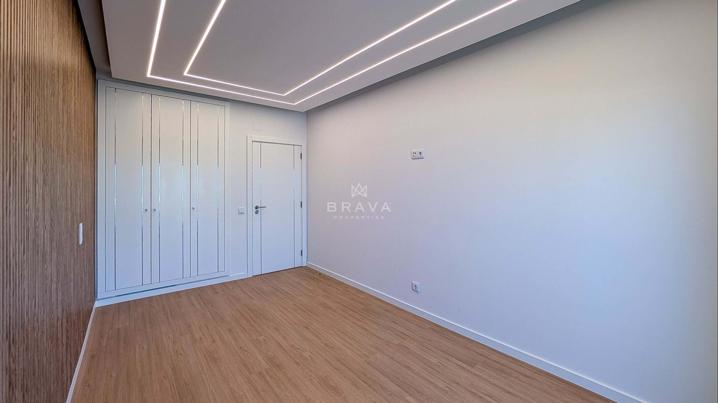 Die Aufteilung erfolgt aus Eingangshalle und Flur mit eingebauter Speisekammer, offener ausgestatteter Küche, Wohnzimmer mit Zugang zu einem Südbalkon und Meerblick, drei Schlafzimmern mit Einbauschränken und Balkon, zwei Badezimmern mit Dusche, eines davon en suite.