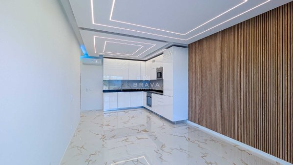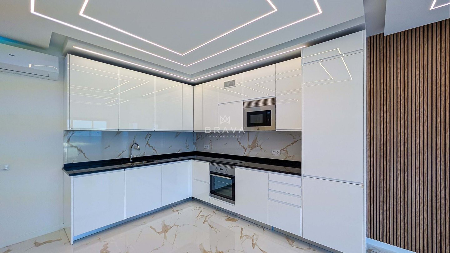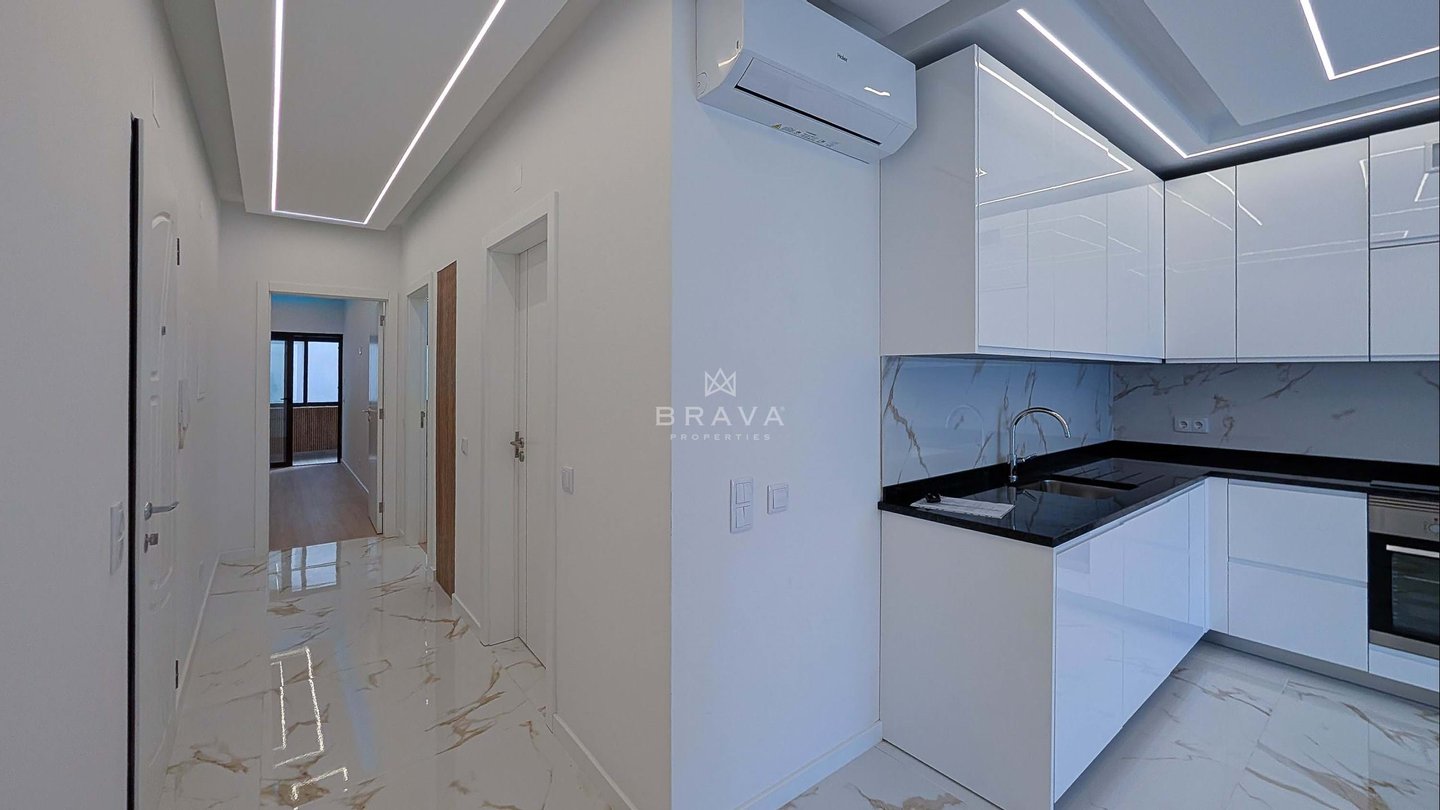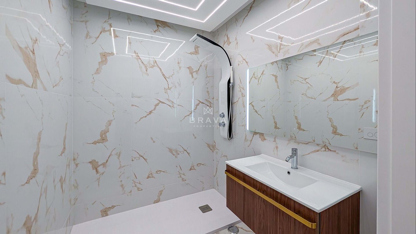 Die Aufteilung erfolgt aus Eingangshalle und Flur mit eingebauter Speisekammer, offener ausgestatteter Küche, Wohnzimmer mit Zugang zu einem Südbalkon und Meerblick, drei Schlafzimmern mit Einbauschränken und Balkon, zwei Badezimmern mit Dusche, eines davon en suite.