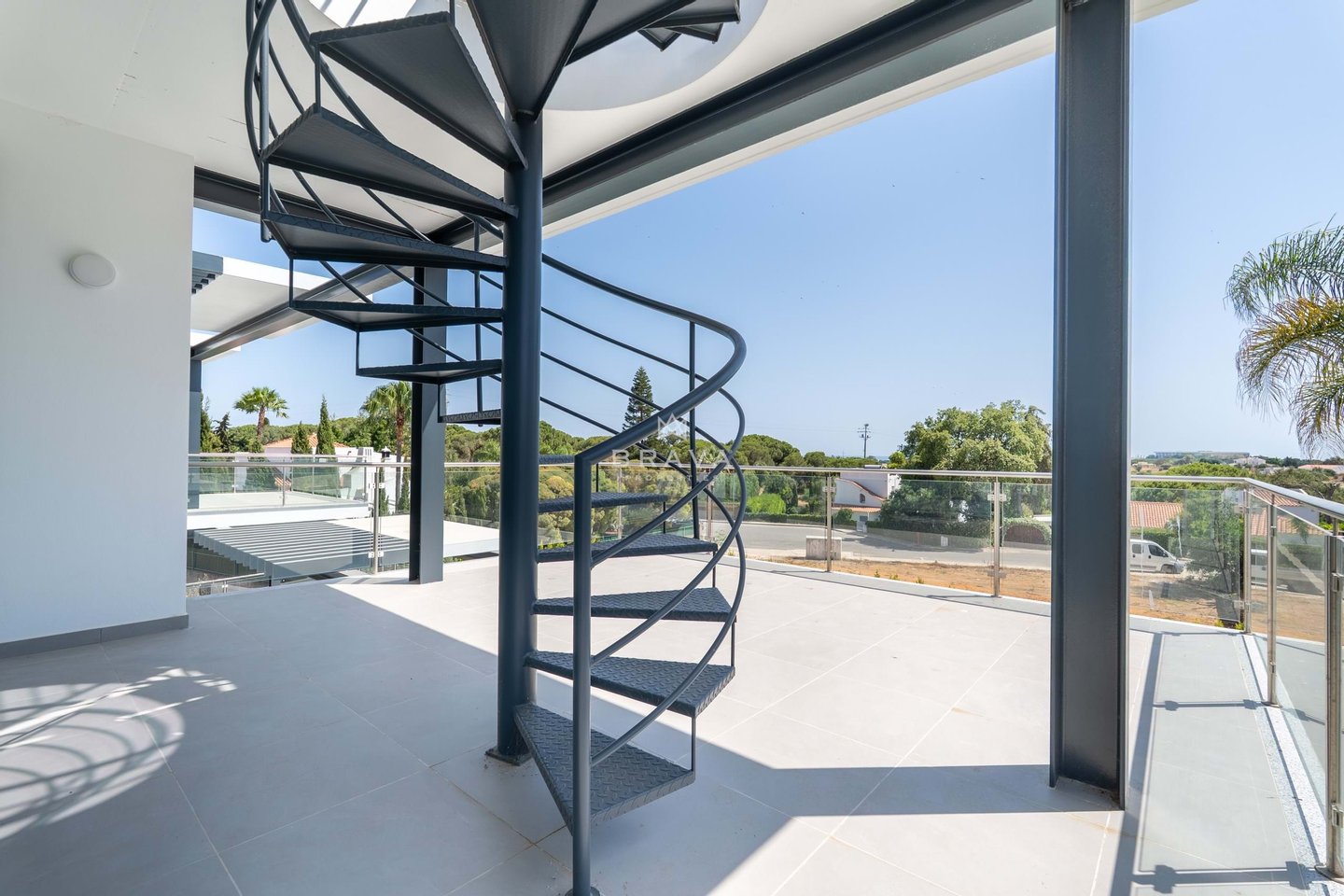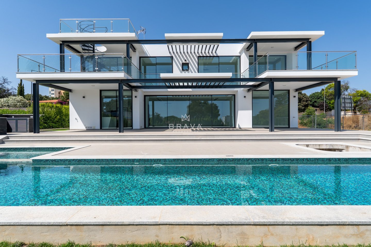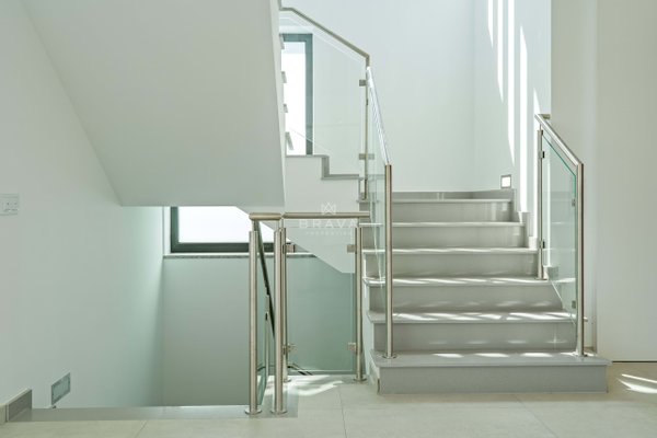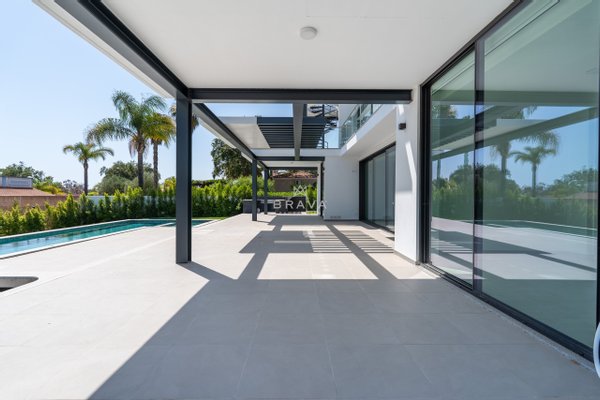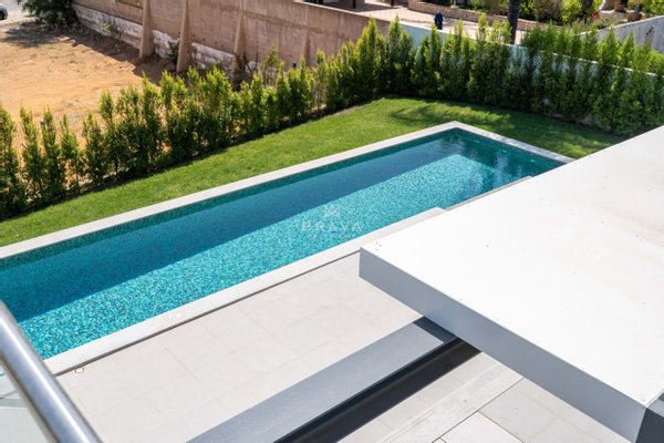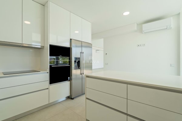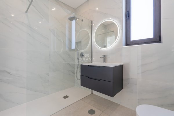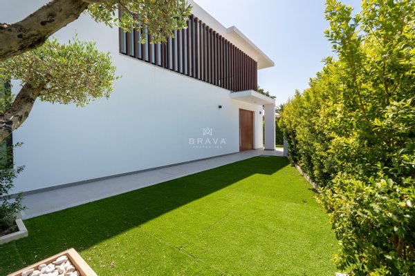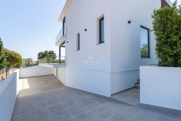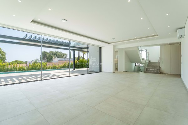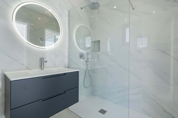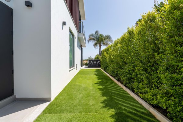 Die Villa erstreckt sich über zwei Etagen plus Penthouse und bietet ein Wohnzimmer und eine Küche mit direktem Zugang zum Pool und Whirlpool, eine Suite im Erdgeschoss und ein Servicebad. Im ersten Stock befinden sich drei Suiten mit Einbauschränken, die alle Zugang zu einer geräumigen Terrasse bieten. Die Sonnenterrasse auf dem Dach bietet Meerblick.