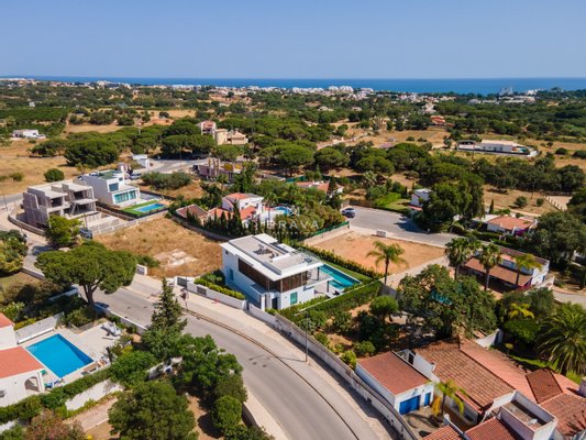 Freistehende Villa in einer ruhigen Gegend von Olhos de Água in Albufeira mit 4 Schlafzimmern en suite und Baujahr 2025 fertiggestellt. Auf einem Grundstück von 727 m² gelegen, verbindet diese Immobilie modernen Komfort mit Privatsphäre und der Nähe