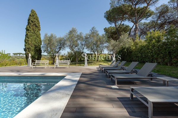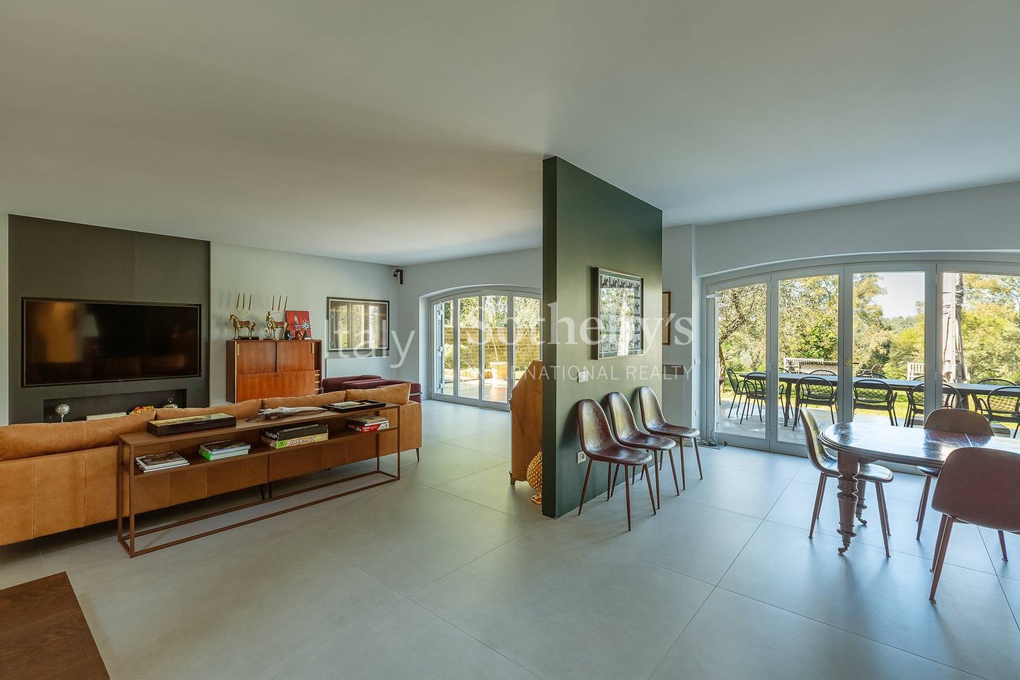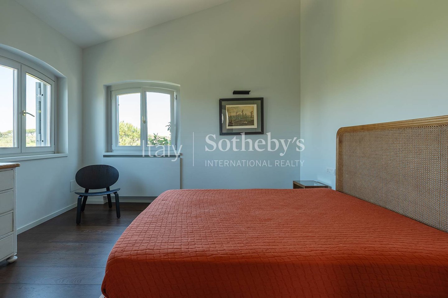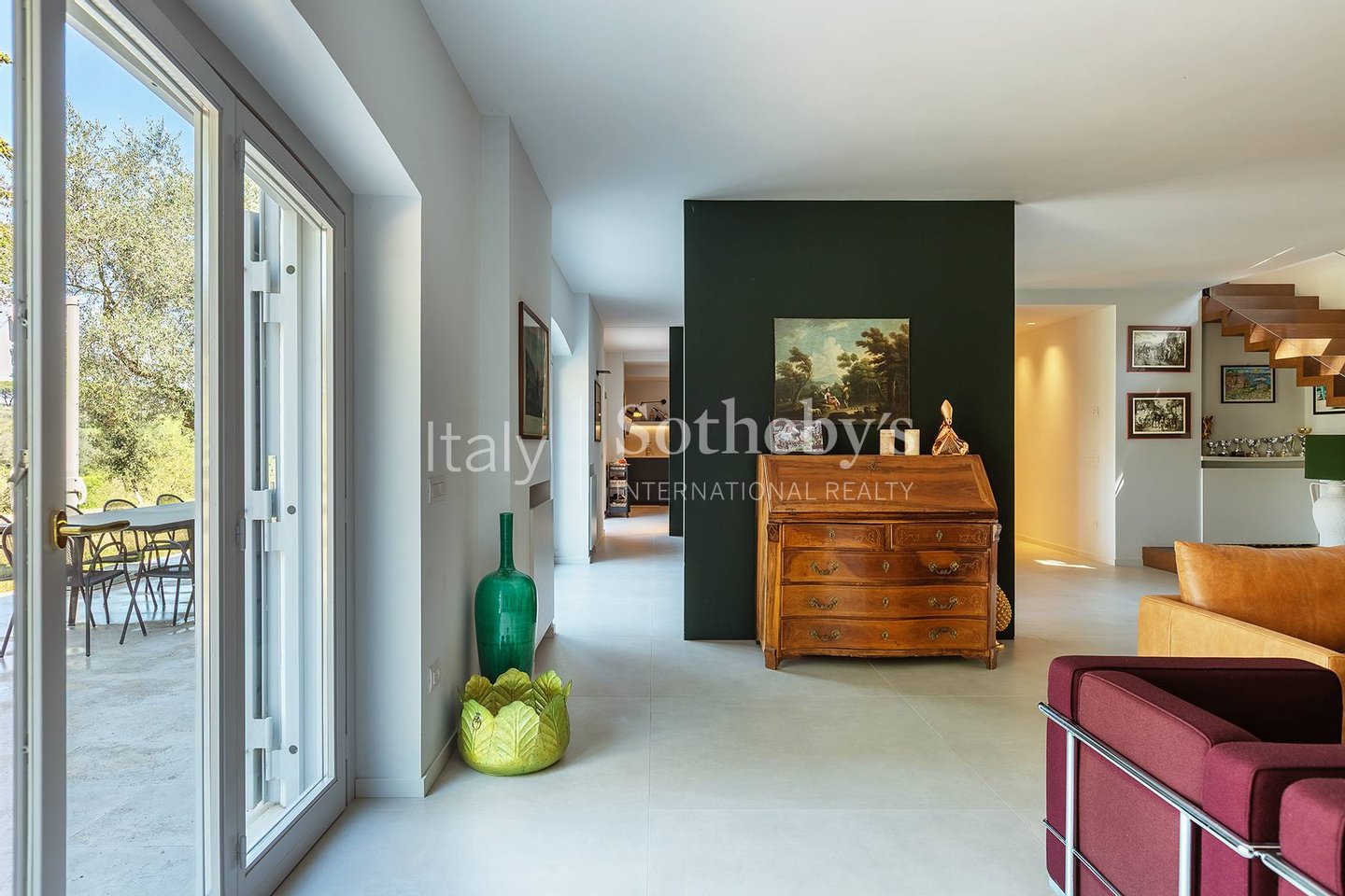Arranged over three levels, the villa offers bright and harmonious interiors, including elegant living rooms with fireplaces, a fully equipped kitchen, and a refined wine cellar area seamlessly connected to the outdoor spaces. The sleeping quarters ensure maximum privacy and feature five bedrooms, each with its own en suite bathroom.