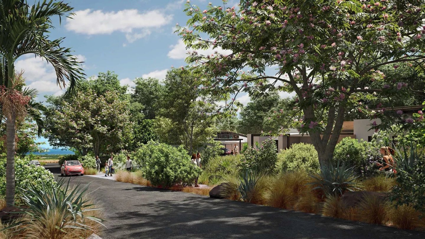 Das Gelände zeichnet sich durch eine einzigartige Savannenlandschaft aus. Das Klima ist sehr trocken, und die Landschaft besteht aus einer Kombination von hohen Gräsern aus Rivière Noire, endemischen Bäumen, Ebenholzbäumen, Tamarinden, kreolischen Agaven und vulkanischem Gestein. Das Landschaftskonzept zielt darauf ab, die natürliche Schönheit des Standorts zu bewahren, indem 100 % der vorhandenen Pflanzen entlang der Straßen wiederverwendet werden und 90 % der Umgebung jeder Villa mit vorhandenen sowie endemischen Pflanzen aus Mauritius gestaltet werden.
