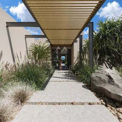 Die Gestaltung dieser Villen sieht vertikale, bewegliche Elemente an der Südfassade vor, um die vorherrschenden Winde abzuschirmen, sowie einen großzügigeren Innenhof, der die Möglichkeit bietet, einen Pool zu integrieren. Es werden drei Schlafzimmer mit eigenem Bad angeboten (ein viertes ist optional verfügbar), und der Wohnbereich ist als ein großzügiger, einladender Raum konzipiert, der eine offene Küche, ein großes Wohnzimmer und ein Esszimmer vereint.