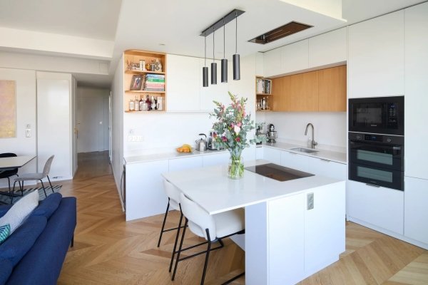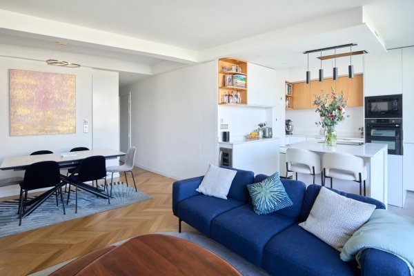 Wohnzimmer mit voll ausgestatteter offener Küche, die auf einen durchgehenden Balkon hinausgeht
