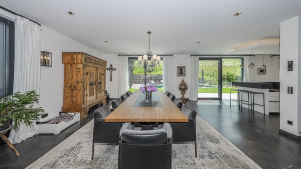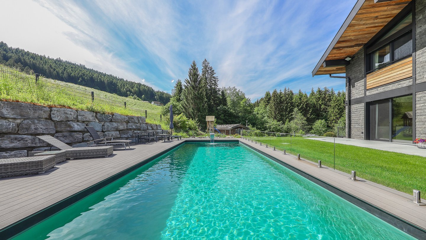 Auf der Rückseite erreicht man den wunderschön angelegten Garten mit mehreren Ebenen, wo sich Natur-Pool samt Poolhaus mit Dusche, Toilette sowie Massageraum und großen Terrassenflächen befinden. Eine historische, originale Tiroler-Almhütte steht ebenfalls im Garten und ist komplett ausgebaut.