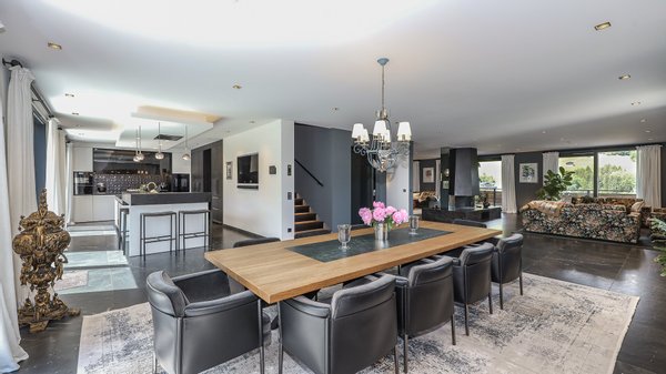 Im Obergeschoss befindet sich der riesige Wohnbereich mit offenem Kamin, der Essbereich sowie die komplett ausgestattete Designerküche mit Back Kitchen. Eine Gäste-Toilette ist auf dieser Ebene ebenfalls vorhanden. Vom Wohnbereich betritt man den Balkon.