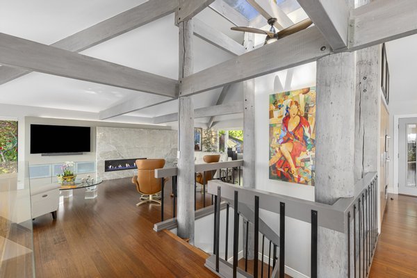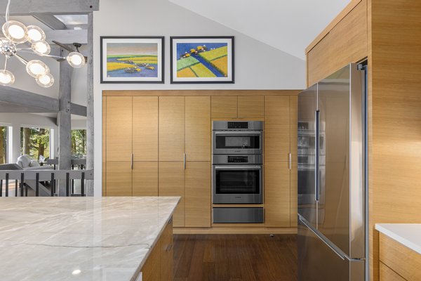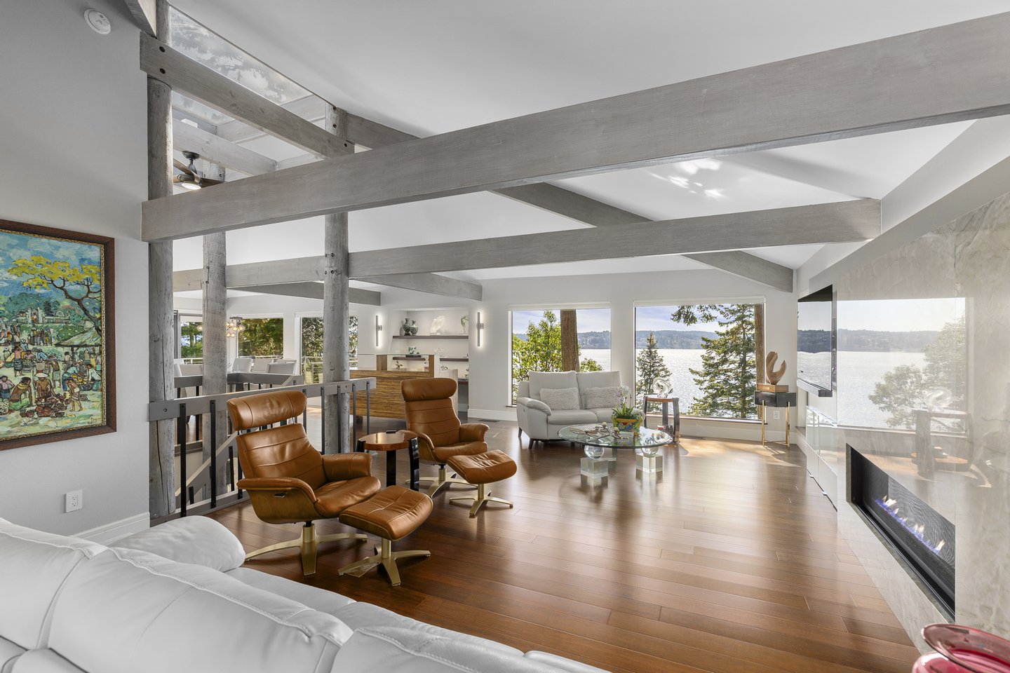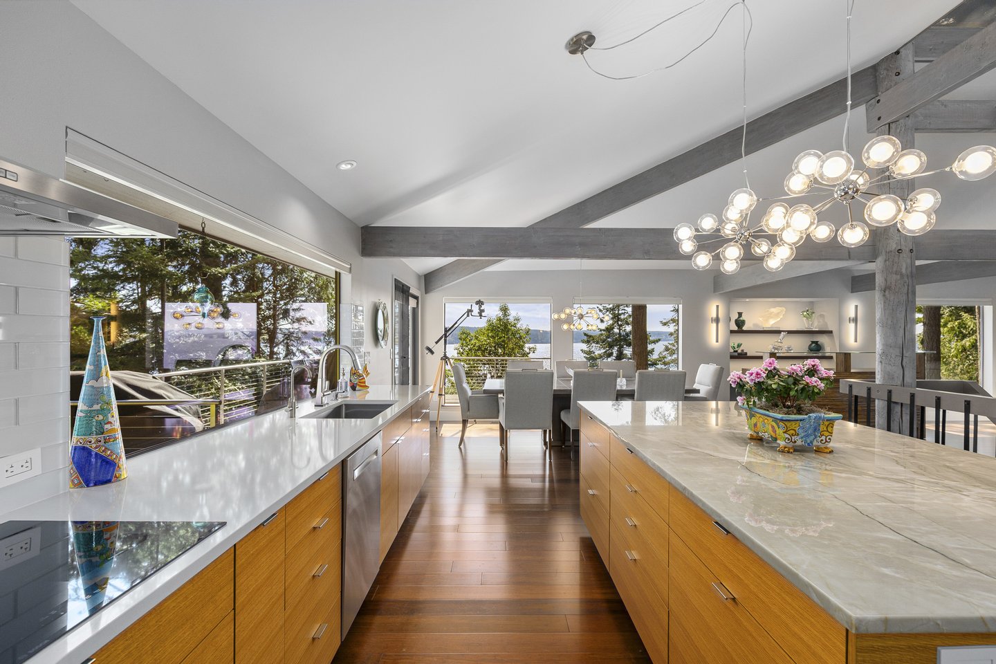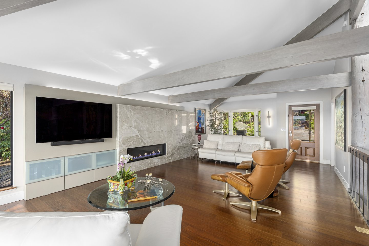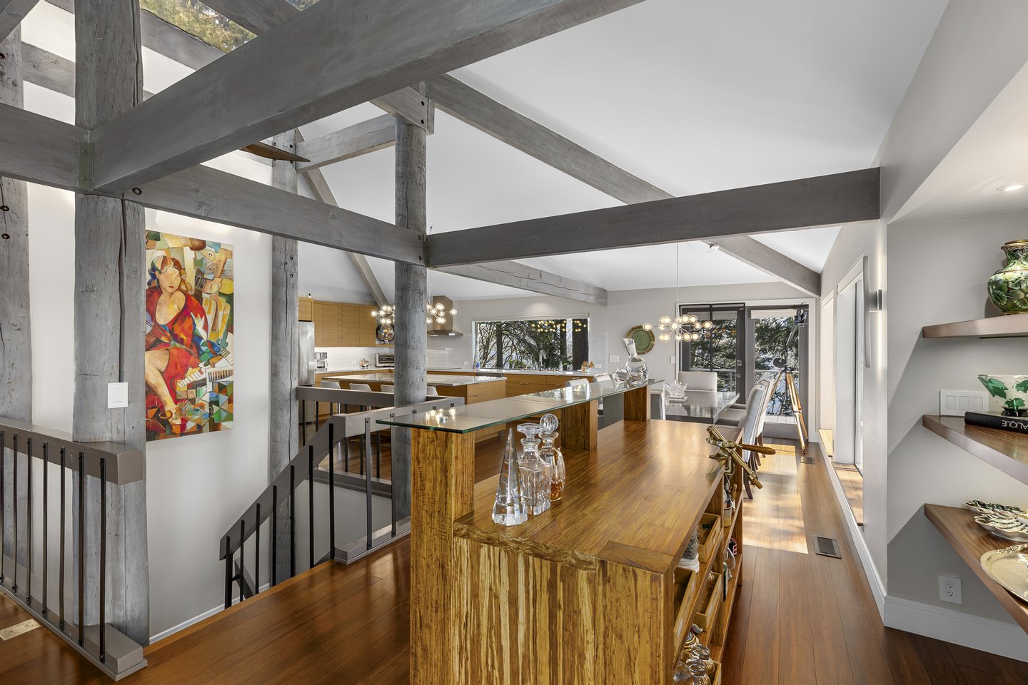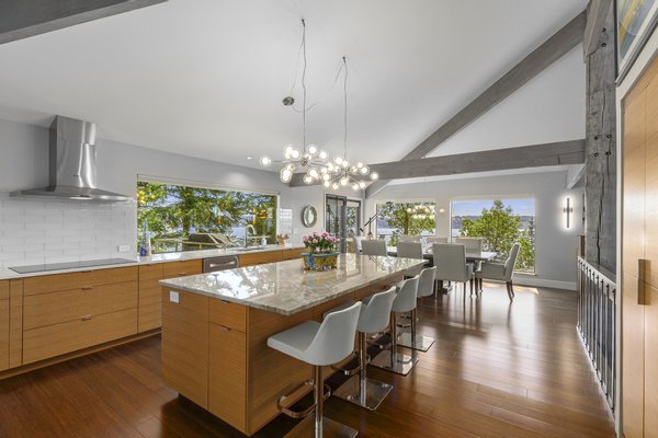 Im Inneren sorgen warme Bambusböden, freiliegende Holzbalken und weitläufige Fenster für eine helle und einladende Atmosphäre. Das Wohnzimmer wird von einem Gaskamin aus Quarzitstein verankert, während das offene Layout nahtlos in eine geräumige Küche mit Bosch-Geräten, Quarz-Arbeitsplatten, einer großen Sitzinsel und maßgefertigten Eichenschränken übergeht.