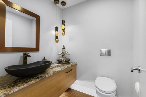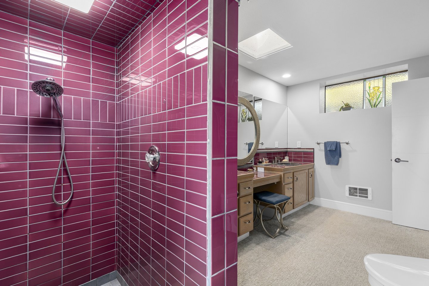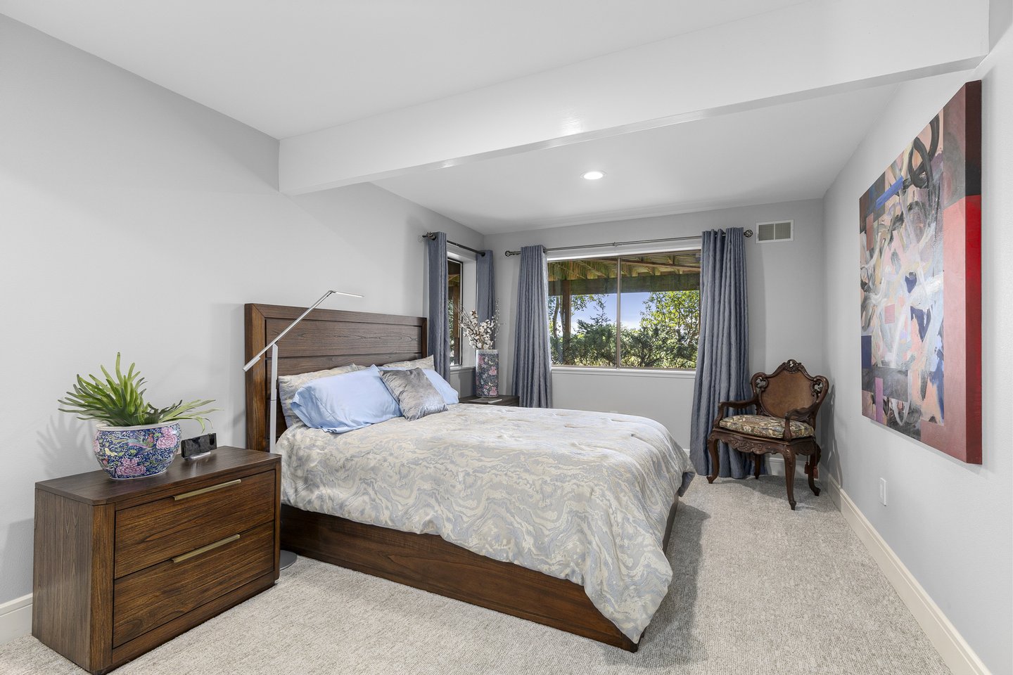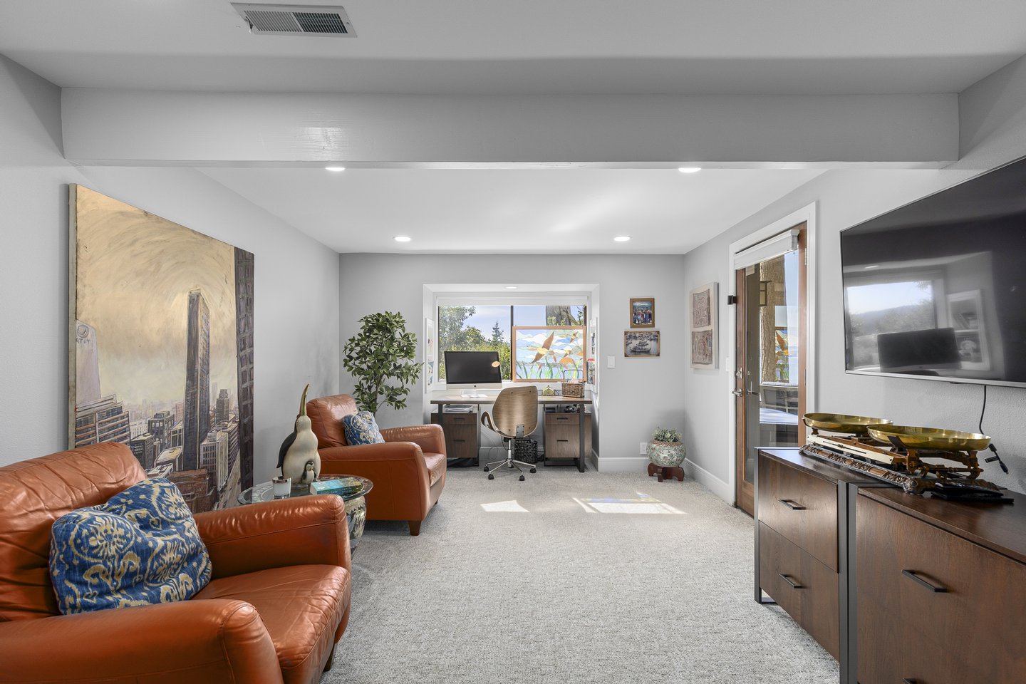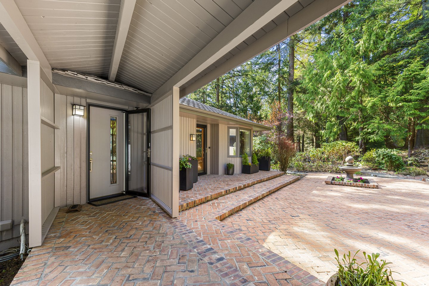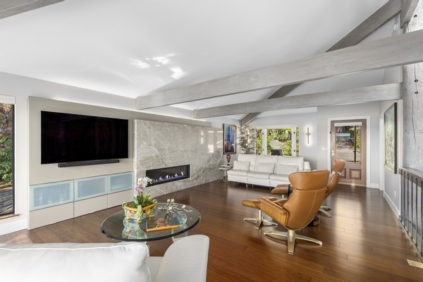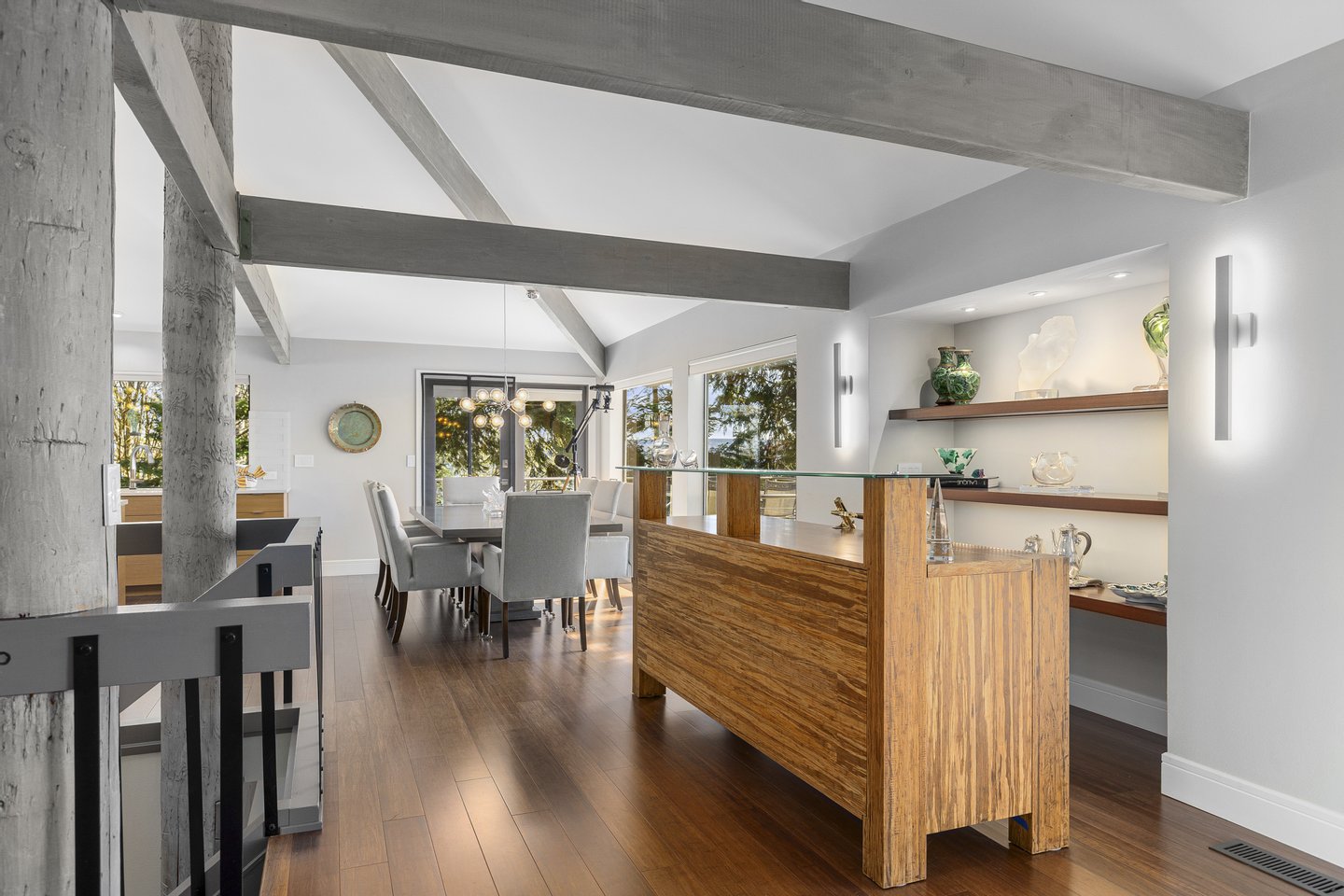 Im Inneren sorgen warme Bambusböden, freiliegende Holzbalken und weitläufige Fenster für eine helle und einladende Atmosphäre. Das Wohnzimmer wird von einem Gaskamin aus Quarzitstein verankert, während das offene Layout nahtlos in eine geräumige Küche mit Bosch-Geräten, Quarz-Arbeitsplatten, einer großen Sitzinsel und maßgefertigten Eichenschränken übergeht.