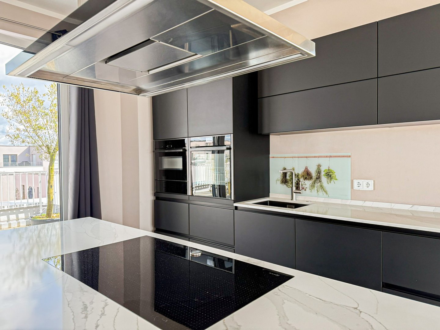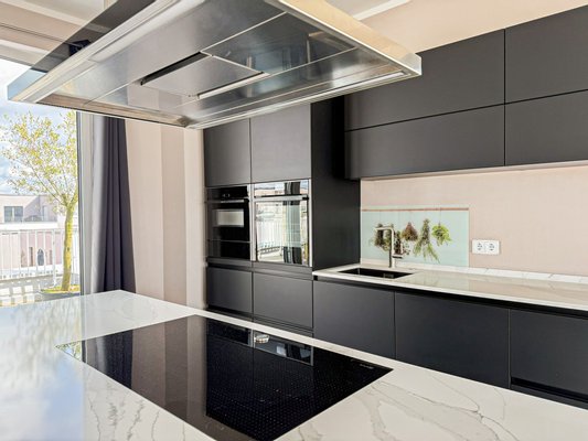 Die hochwertige SCHÜLLER-Einbauküche mit beleuchteter Kochinsel, Induktionskochfeld und Side-by-Side-Kühlschrank kann nach Absprache übernommen werden.