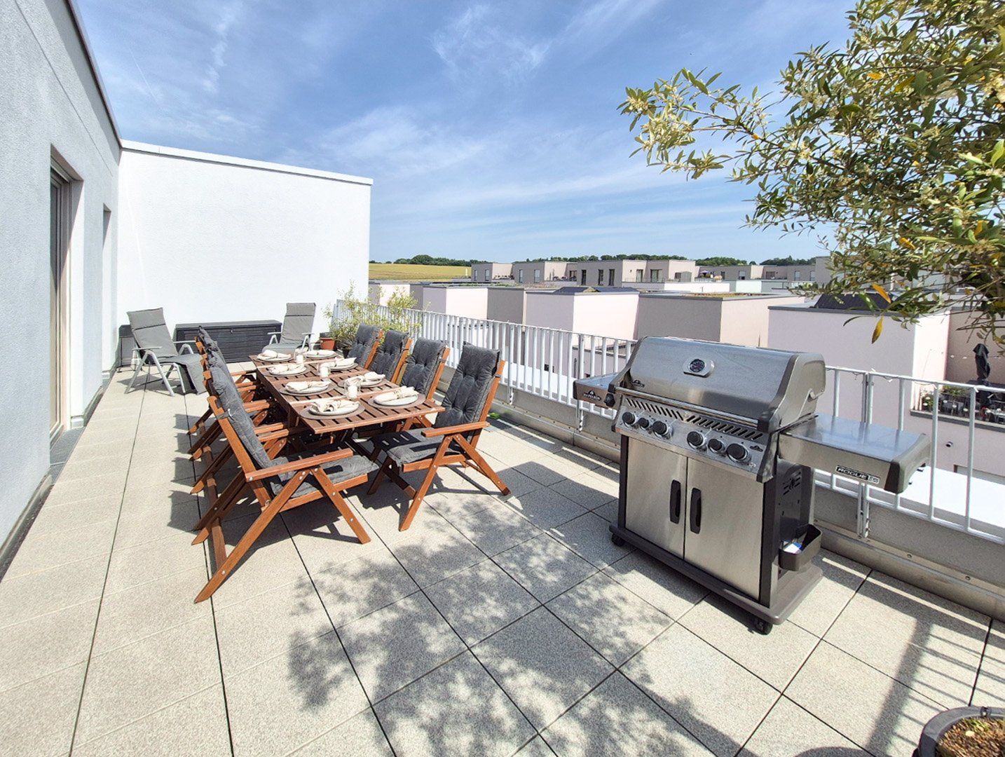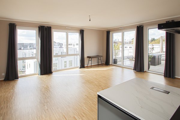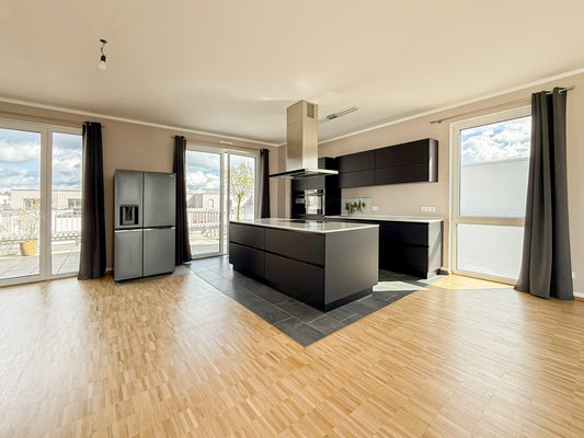 Das Highlight ist der 60 m² große, offene Wohnbereich mit offener Küche und Zugang zu beiden Dachterrassen.