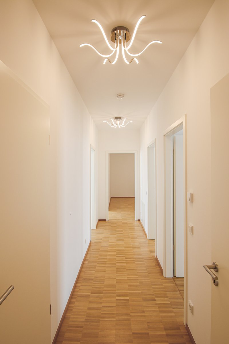 Elegantes Eichenparkett zieht sich durch das gesamte Penthouse. In den Bädern liegt großformatiges Feinsteinzeug.