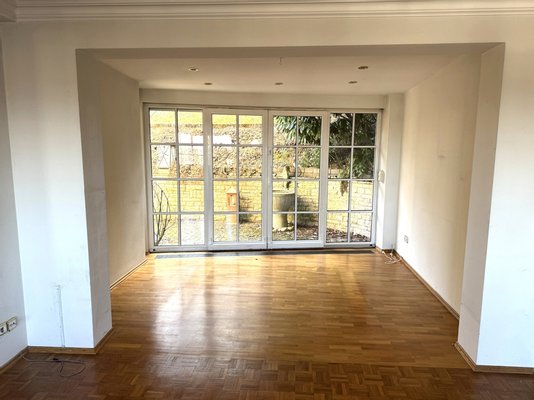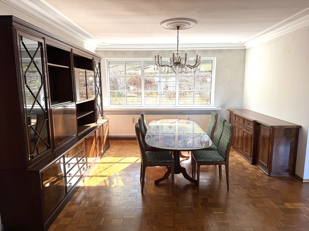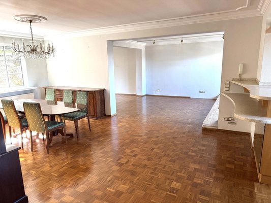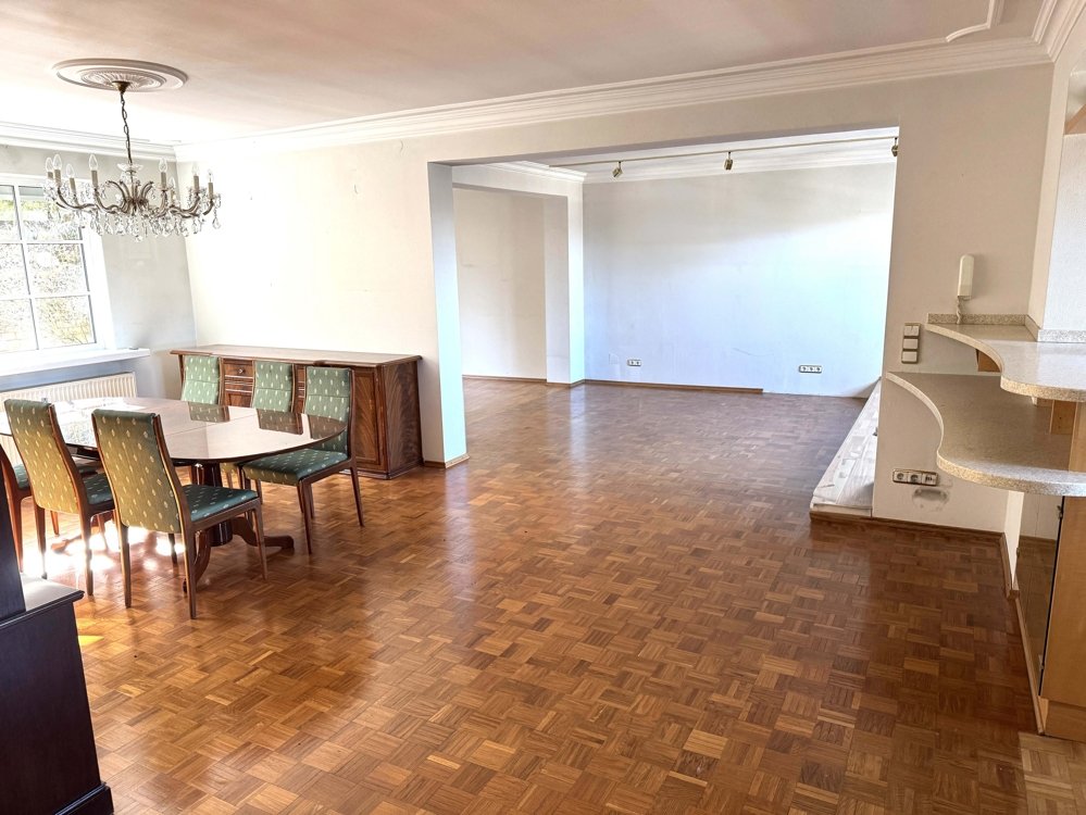 Die Wohnung im Erdgeschoss wurde im Jahr 1999 umfassend saniert und überzeugt durch einen besonders großzügigen und offenen Wohnbereich. Esszimmer und Küche gehen fließend ineinander über und schaffen eine einladende Atmosphäre für den Alltag und gesellige Stunden. Das angrenzende Wohnzimmer bietet direkten Zugang zur Terrasse und damit eine angenehme Verbindung zum Außenbereich. Ergänzt wird diese Etage durch ein Schlafzimmer mit Ankleide sowie ein Bad en suite. Ein Gäste-WC steht ebenfalls zur Verfügung.