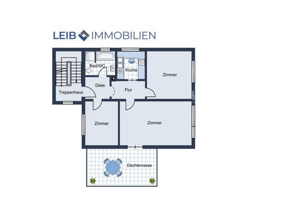Im Obergeschoss befindet sich eine weitere Wohneinheit mit drei Zimmern, die sowohl als separate Wohnung genutzt werden kann als auch ideal als Erweiterung für eine Nutzung als Einfamilienhaus dient. Das größte Zimmer verfügt über einen direkten Zugang zur großzügigen Dachterrasse und eröffnet zusätzliche Aufenthaltsqualität im Freien.