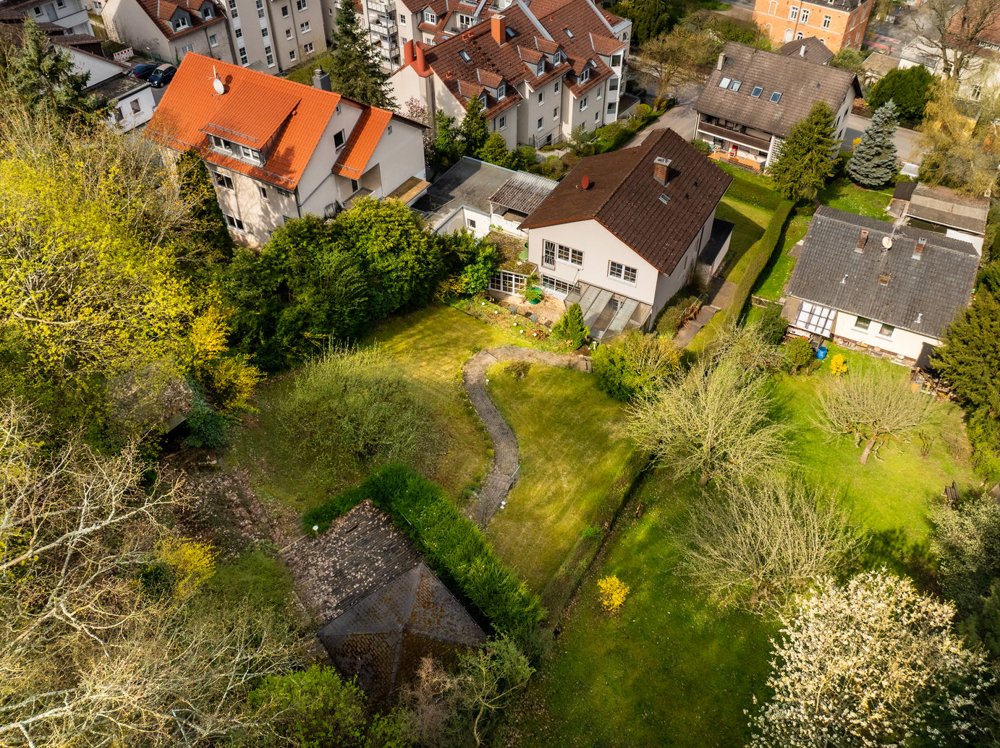 Zum Haus gehören außerdem zwei Einzelgaragen. Das große Hanggrundstück bietet viel Platz und begeistert mit einer besonders schönen Aussicht. Vom Gartenhäuschen aus genießen Sie einen weiten Blick in Richtung Schloss Callenberg sowie bis in den Thüringer Wald.