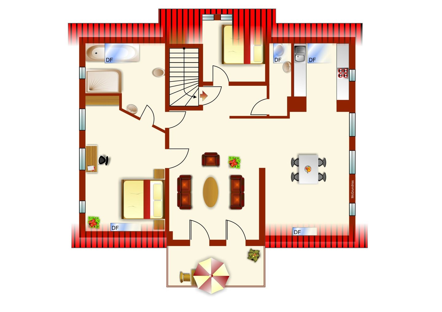 Die Wohnung wird durch eine als Garderobe nutzbare Diele betreten, eine elegante Treppe führt zum Eingang der Wohn-Ebene. Der Grundriss ist in weiten Teilen flexibel.
