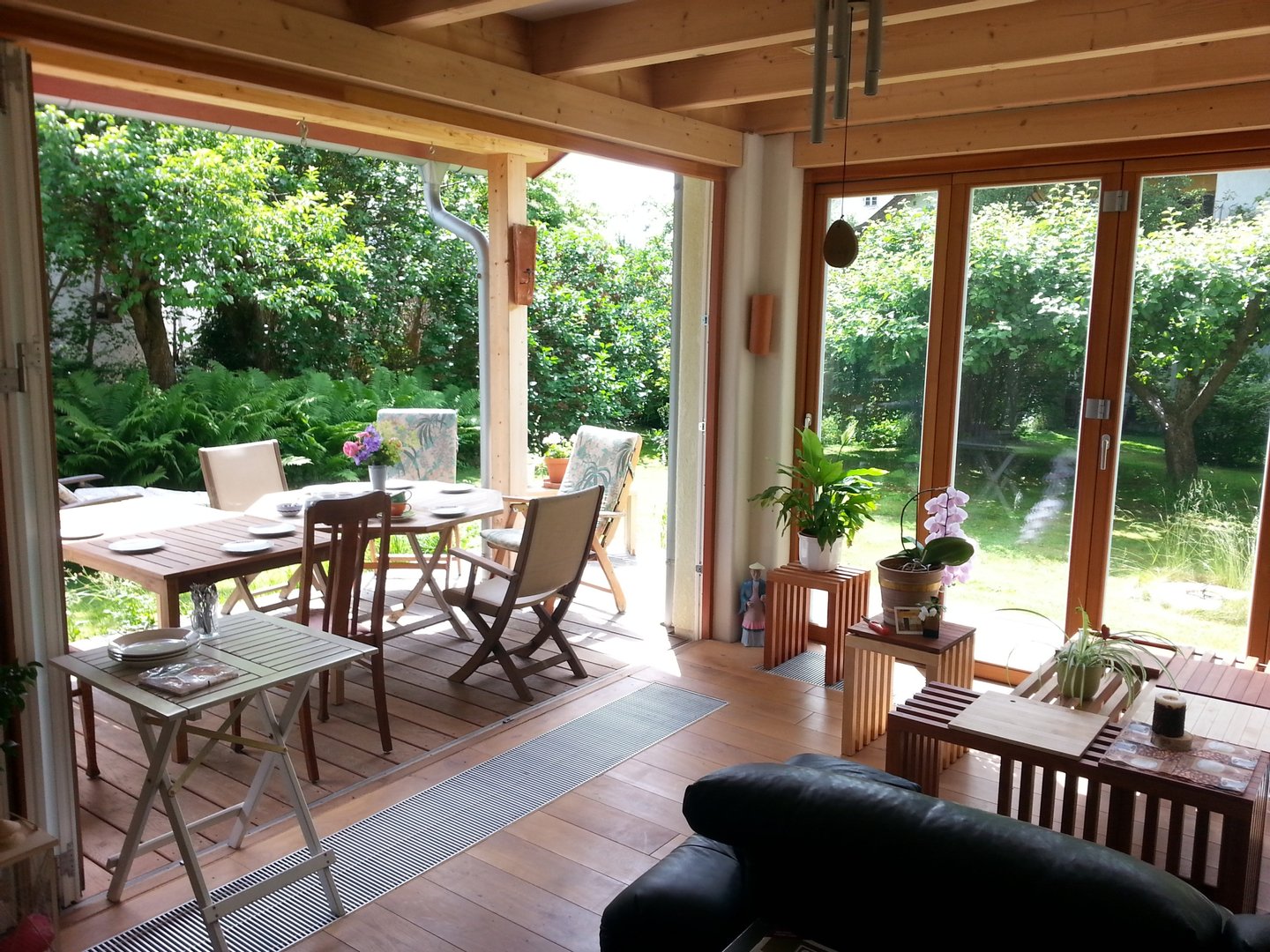 3 große 5-flügelige Falt-Schiebetüren (vollständig zu öffnen und fließender Übergang nach außen) + 2 dreiflügelige Elemente