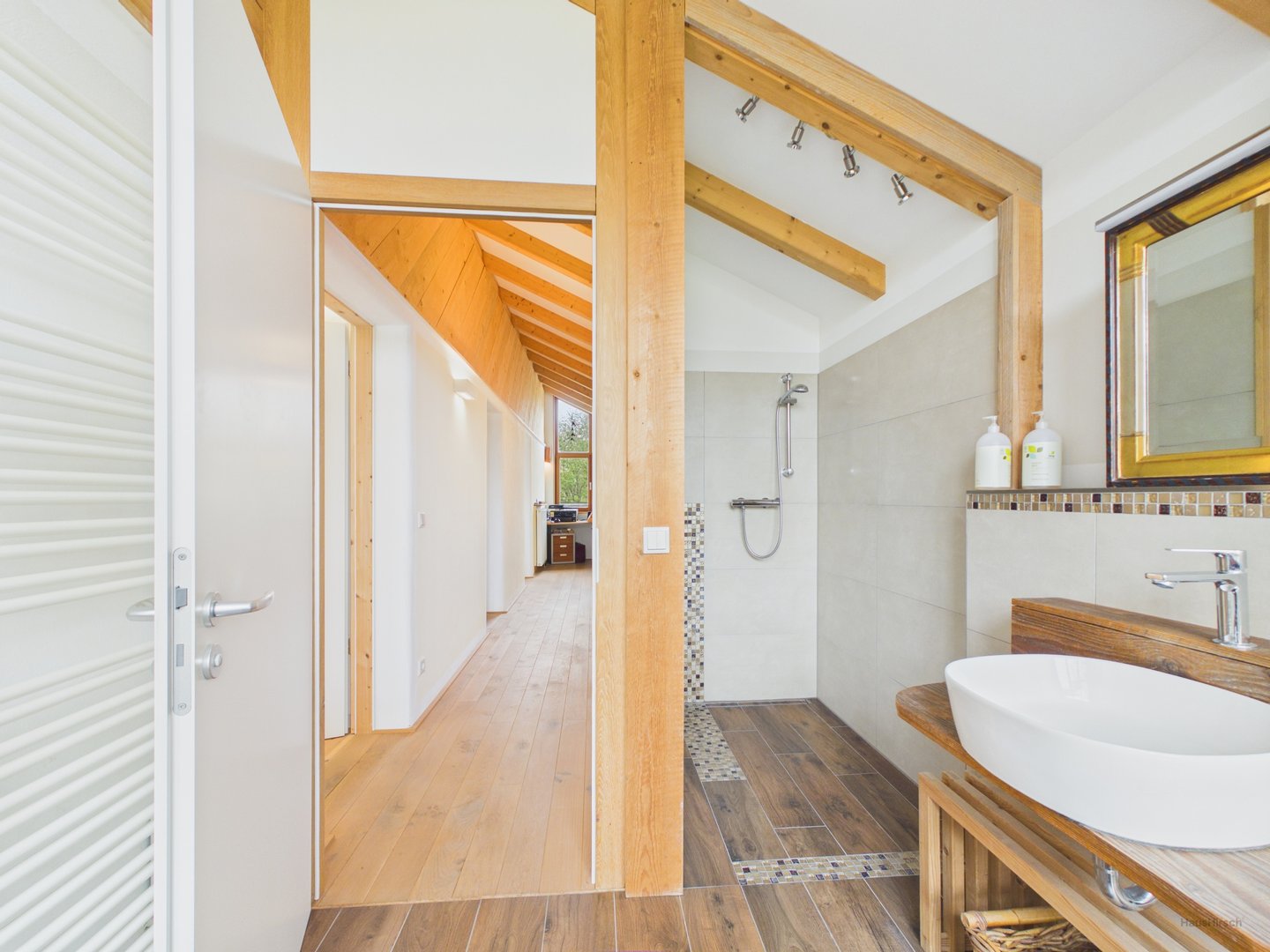 OG: Eiche im Flur, Fichte weiß pigmentiert geölt in den Zimmern