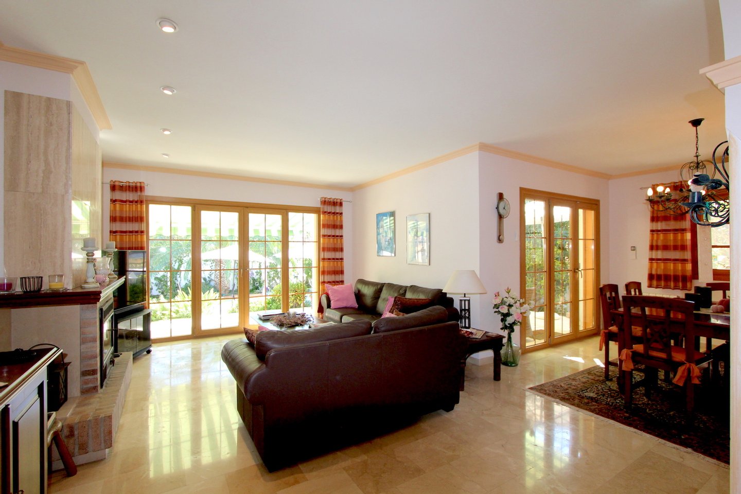 Das Haus selbst überzeugt durch seine ebenerdige Bauweise und einen harmonischen Grundriss. Vom einladenden Eingangsbereich öffnet sich der Wohn- und Essbereich mit Kamin. Große Fenster schaffen einen fließenden Übergang zwischen Innen und Außen und führen direkt auf die Terrasse und in den Garten. Die modern ausgestattete Küche befindet sich direkt angrenzend an den Wohn-und Essbereich. Drei Schlafzimmer und zwei Badezimmer, darunter ein en-suite Bad, bieten ausreichend Raum für Familie und Gäste.