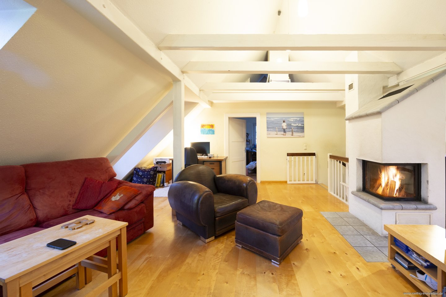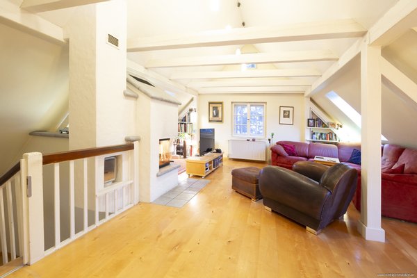 Über eine elegante Treppe aus Birkenholz gelangen Sie in das Ober-/Dachgeschoss des Hauses, wo Sie ein weitläufiger Wohnbereich mit einer beeindruckenden Raumhöhe von bis zu 4,10 m empfängt. Der stilvoll integrierte, nachträglich eingebaute Heizkamin sorgt im Winter für behagliche Wärme und verleiht diesem Bereich eine besondere Wohnqualität. Durch die Lichtführung von zwei Seiten wird der Raum den ganzen Tag über mit Tageslicht durchflutet, während ein nahezu bodentiefes Fenster den Blick in den liebevoll angelegten Garten bietet.