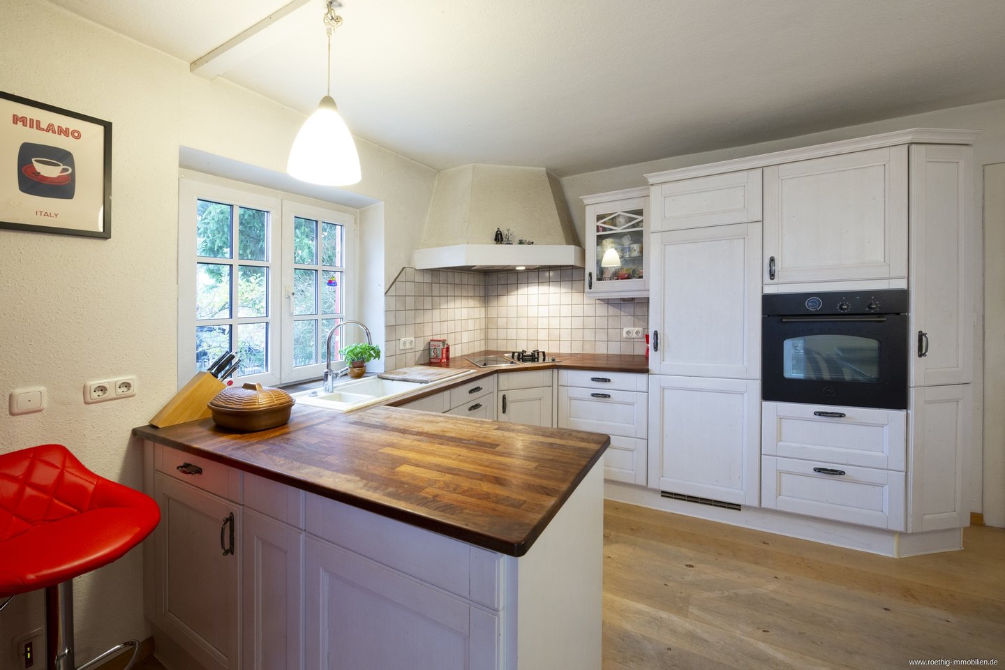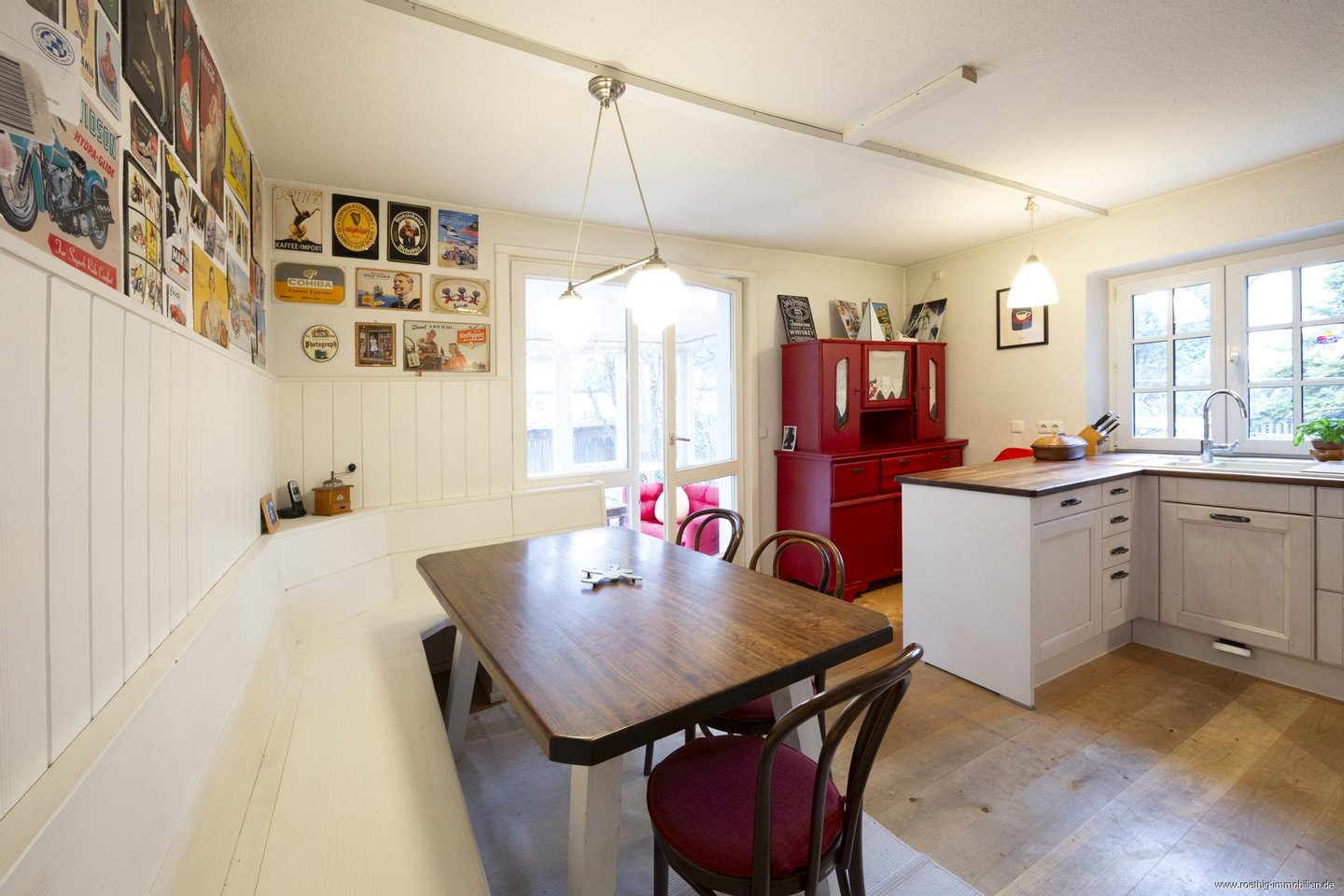Der helle, freundliche Küchen- und Essbereich mit maßgefertigter Eckbank empfängt Sie mit einer warmen und einladenden Atmosphäre und wird durch reichlich Tageslicht perfekt in Szene gesetzt. Von hier aus betreten Sie den rundum verglasten Wintergarten – einen behaglichen Ort, der zu jeder Jahreszeit als Erweiterung des Wohnraums dient und dank seiner vollständigen Beheizung ganzjährig genutzt werden kann. Die moderne Einbauküche mit umlaufender Arbeitsfläche und zahlreichen Schränken sowie einem Dominokochfeld mit einem Wokgasbrenner bietet nicht nur viel Komfort und Stauraum, sondern stellt auch einen harmonischen Treffpunkt für Familie und Freunde dar. Somit steht zukünftigen Kochabenden nichts mehr im Wege.