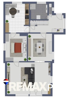 Im Erdgeschoß befinden sich eine Küche, ein Badezimmer, ein separates WC, ein Schlafzimmer sowie ein großes, helles Wohnzimmer. Vom Wohnzimmer aus gelangt man auf eine nette Terrasse, von der aus sich ein wunderbarer Blick über den gesamten Garten bietet – perfekt zum Entspannen oder für gesellige Stunden im Freien. Zusätzlich besteht die Möglichkeit, das Haus mit Brennholz zu beheizen,