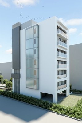 Calamari (Karabournaki), Neugebaute Obergeschosswohnung, 3. Stock, Gesamtfläche 168 m², Baujahr 2025. Besteht aus drei Schlafzimmern (jeweils mit eingebautem Vierflügel-Schrank), Wohnzimmer, Küche, Bad, WC und Zugang zu Balkonen von jedem Raum des