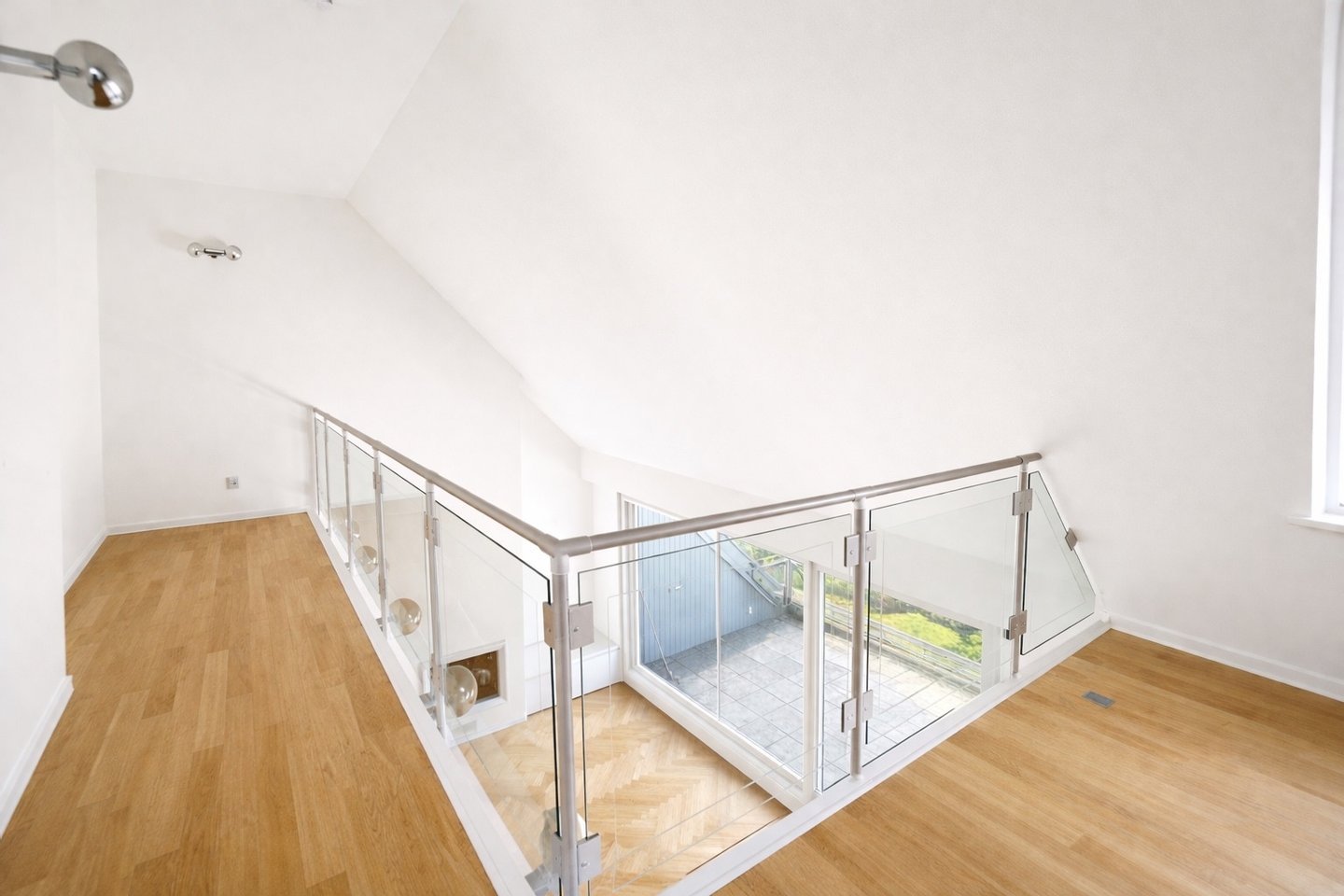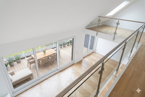 Über eine offen gestaltete Treppe gelangen Sie in das Obergeschoss. Hier eröffnet sich die eindrucksvolle Galerie, die einen direkten Blick in den Wohnbereich ermöglicht und das offene Wohnkonzept unterstreicht. Dieser Bereich eignet sich ideal als Lounge, Arbeitsbereich oder Rückzugsort.