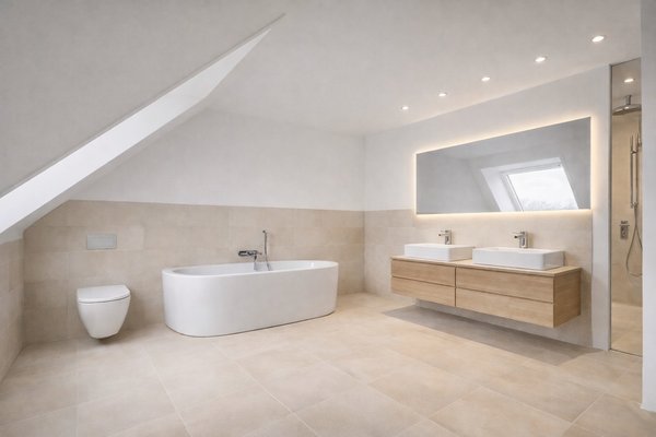 Im oberen Geschoss befinden sich zwei weitere Zimmer, darunter das großzügige Hauptschlafzimmer mit separat integriertem Ankleidebereich. Ein weiteres Highlight ist das große Tageslichtbad mit Dusche, Badewanne, Doppelwaschbecken und Bidet – ein Ort, der Komfort und Funktionalität perfekt vereint.