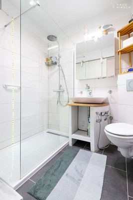 Im Eingangsbereich auf der rechten Seite liegt dann das innenliegende Badezimmer mit bodentiefer Dusche und elektrischer Fußbodenheizung.