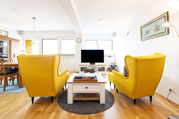 Am Endes des Flurs befinden sich links die große offene Küche, den Essbereich mit Austritt zum Balkon und das Wohnzimmer. Die Öffnung des Grundrisses hat der Wohnung dabei einen besonderen Touch gegen, denn wo spielt sich das Leben ab?