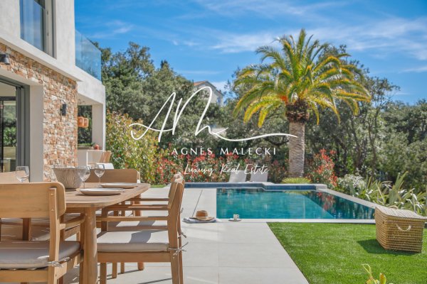 LA CROIX VALMER auf einem Privatanwesen nahe den Stränden und dem Dorf MIT ANGELEGTEN FLÄCHEN aus Olivenbäumen und anderen Pflanzen, die 2000 m² umfassen – In einem ruhigen Bereich innerhalb eines privaten und umzäunten Anwesens gelegen, bietet diese geräumige, moderne 256 m² große Villa, komplett renoviert bis zum HÖCHSTEN ENDE, einen Panoramablick auf das Meer. Es verfügt über zwei Ebenen: eine Eingangshalle mit Anschluss an das Alarmsystem, eingebauten Stauraum, Gästetoilette mit Zugang zur Garage, ein stufenfreies Wohn-/Esszimmer, das direkt zum beheizten Infinity-Pool mit untergetauchtem Strandbereich führt, eine Küche mit einer zentralen Insel von MIELE/BORA, einen Hauswirtschaftsraum, einen Wasserenthärter, eine Waschmaschine, ein durchgehendes Warmwasserkreislaufsystem. Reichlich Stauraum, ein Liebherr-Weinkeller, ein Kühlschrank, ein Schreibtisch und ein elektrischer Kamin im Wohnzimmer – ein MUSS! Weitere Schlafzimmer sind: Schlafzimmer 1 mit Umkleideraum, ein großes Badezimmer mit voll integrierter Dusche und Schiebetüren. Obergeschoss: Fitnessstudio mit Soundanlage mit Zugang zu einem Solarium mit Meerblick, Hauptschlafzimmer (Suite 03) mit Panoramablick auf das Meer, Dusche, Doppelwaschbecken, Toilette, Büro und Umkleideraum, prächtiges Schlafzimmer 04 mit Solarium, Duschraum, Doppelwaschbecken und Gartenzugang, Schlafzimmer 05 mit Duschraum, Doppelwaschbecken und Toilette. Draußen: Außen-Sommerküche mit großem Gasgrill zum Meer hinaus, gepflasterte Einfahrt und Haupteingang, großer Pétanque-Court im Innenhof, Pool und Gartenschuppen, Beleuchtung im gesamten Grundstück sowie Aluminiumrinnen. Heizung: Drehbare Unterboden- und Kanalheizung auf beiden Ebenen, elektrischer Kamin. Garage mit Zugang zur Villa sowie mehrere Parkplätze bei der Ankunft. LUXURIÖSE ANNEHMLICHKEITEN ... IMMOBILIE MÖBLIERT VERKAUFT!