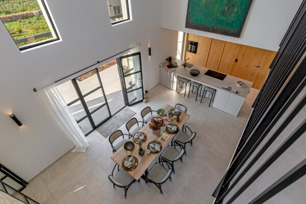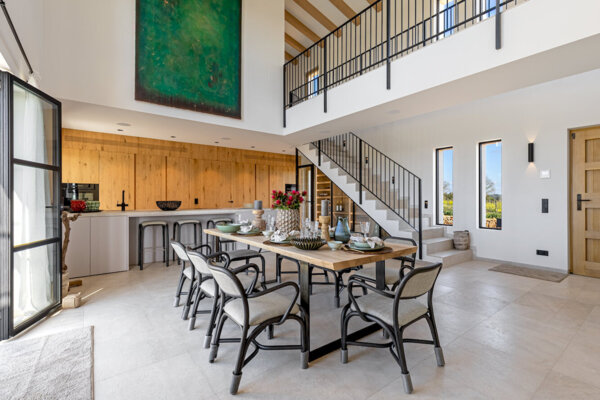 Im Erdgeschoss öffnet sich ein großzügiger Wohnbereich mit beeindruckender Raumhöhe und einer schönen Galerie. Sichtbare Holzbalken und eine traditionelle Natursteinwand verleihen dem Herzstück des Hauses Charakter und Behaglichkeit. Die offene Designküche mit Miele-Geräten, großer Kochinsel und einer stilvollen Vinothek unter der Treppe erfüllt höchste Ansprüche.
