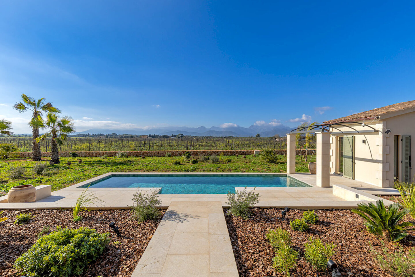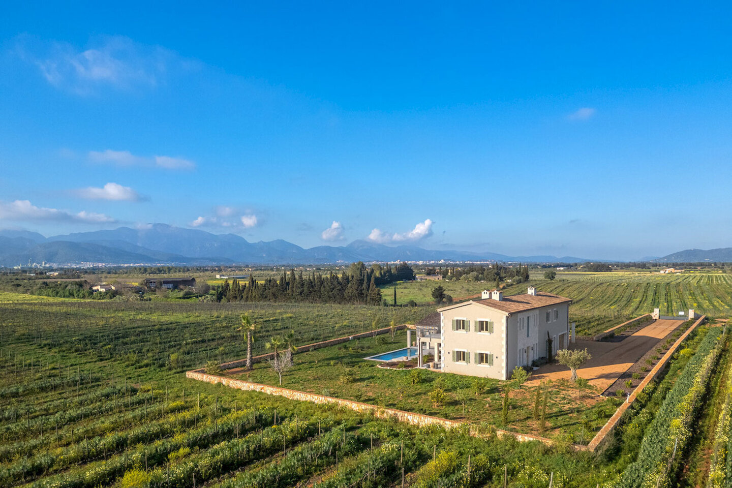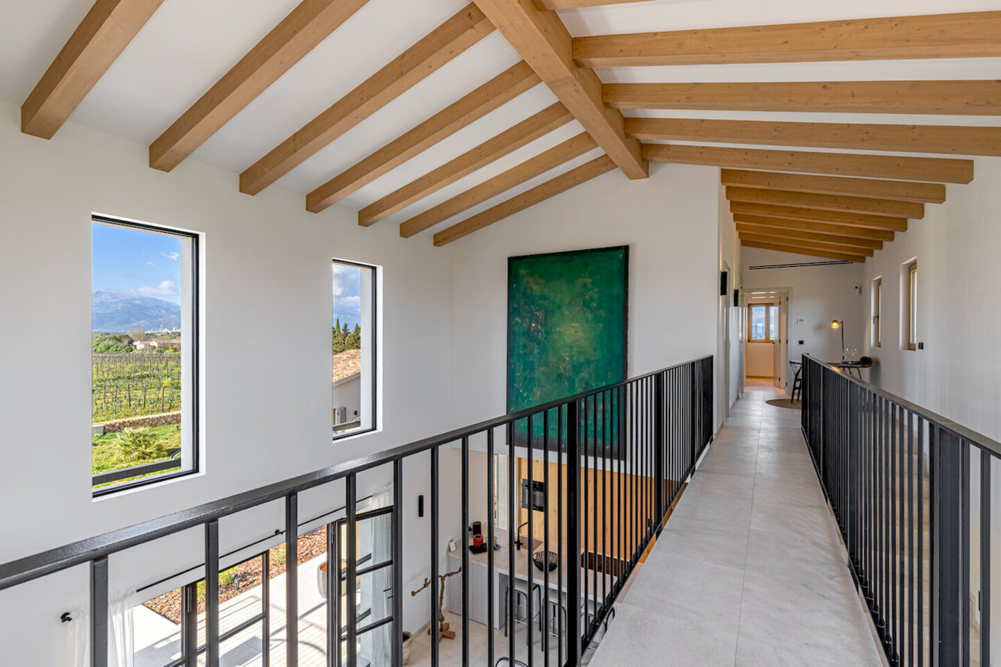 Zwischen den Weinbergen von Sencelles liegt dieses außergewöhnliche Fincaanwesen, das moderne Architektur mit mallorquinischer Authentizität verbindet. Naturstein, warme Holzelemente und ausgewählte Materialien schaffen eine Atmosphäre zeitloser Eleganz. Der Panoramablick erstreckt sich über die eigenen Reben bis zur Tramuntana und zur historischen Dorfkirche. Das Anwesen wird von traditionellen Trockensteinmauern und einem liebevoll angelegten mediterranen Garten eingerahmt; ein alter Olivenbaum am Eingang begrüßt Bewohner und Gäste.