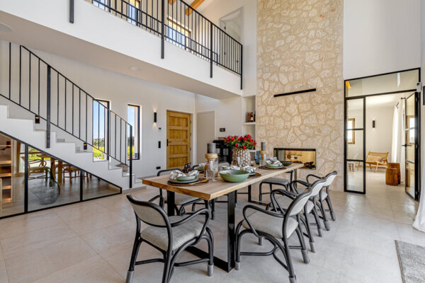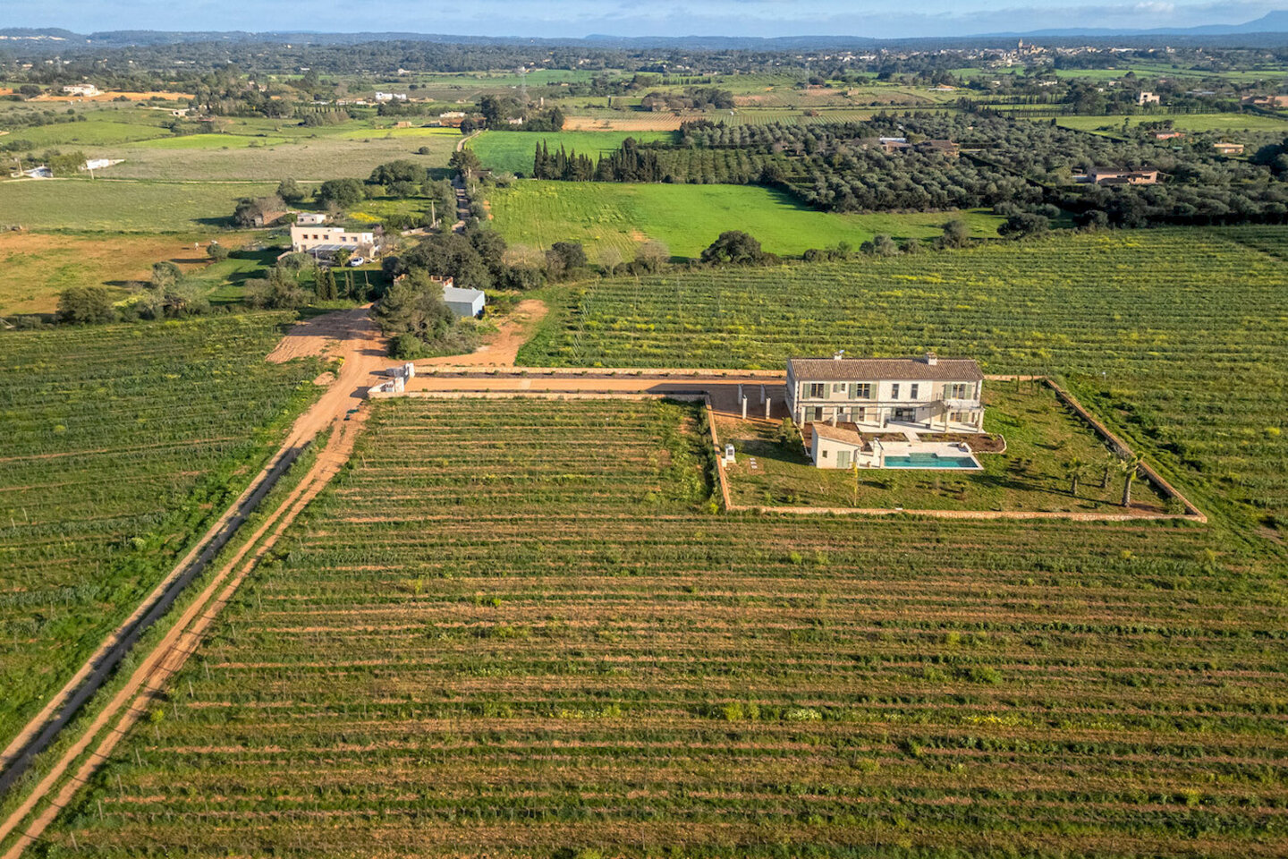 Zwischen den Weinbergen von Sencelles liegt dieses außergewöhnliche Fincaanwesen, das moderne Architektur mit mallorquinischer Authentizität verbindet. Naturstein, warme Holzelemente und ausgewählte Materialien schaffen eine Atmosphäre zeitloser