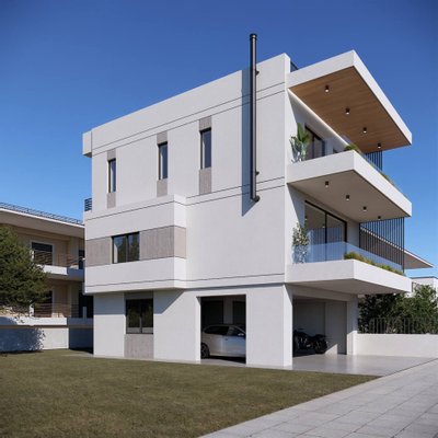 Die Immobilie verfügt über 3 Badezimmer (jeweils eines pro Ebene) und große Balkons mit moderner architektonischer Ästhetik.