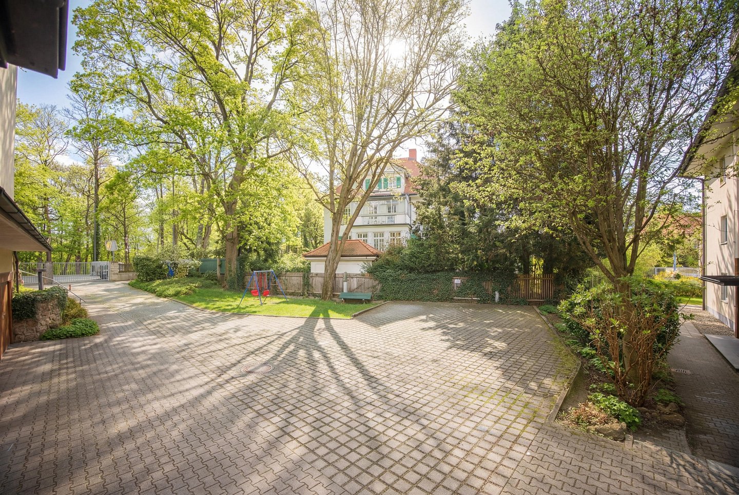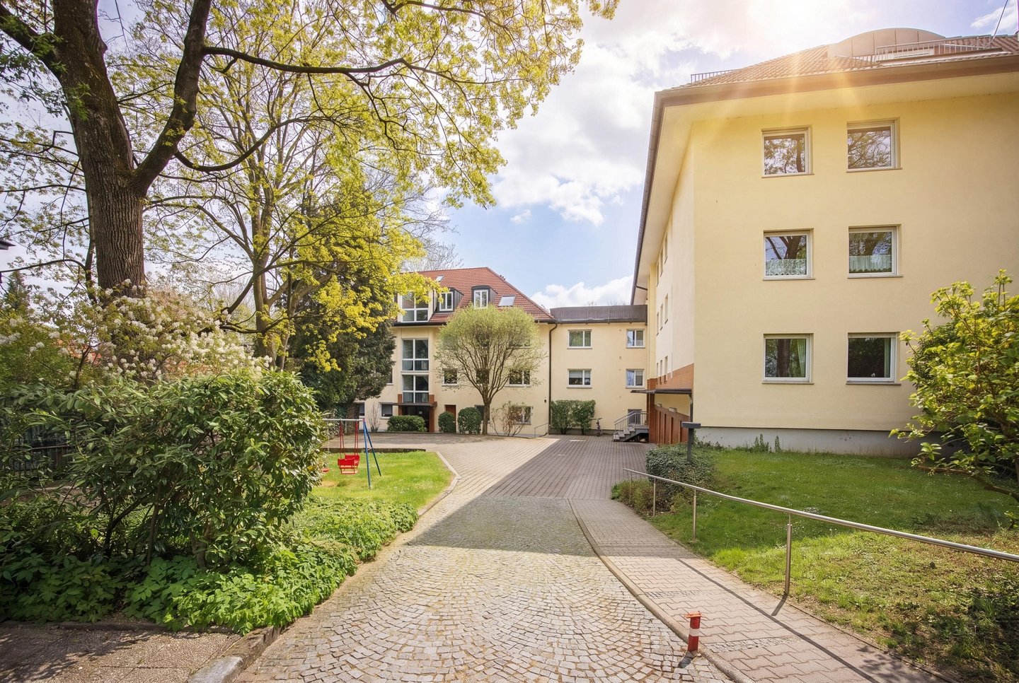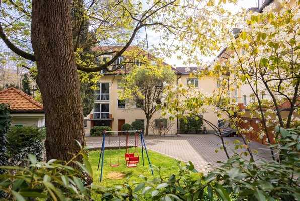 Die Anlage ist von der Straße zurückgesetzt und bildet dadurch einen geschützten gemeinschaftlichen Bereich mit viel Grün und angenehmer Ruhe. Dieser Umstand prägt das Wohngefühl bereits beim Ankommen.