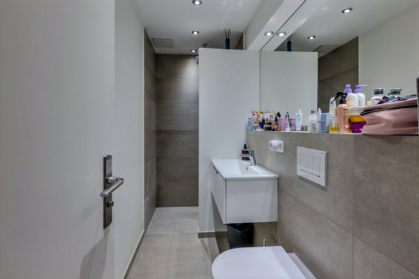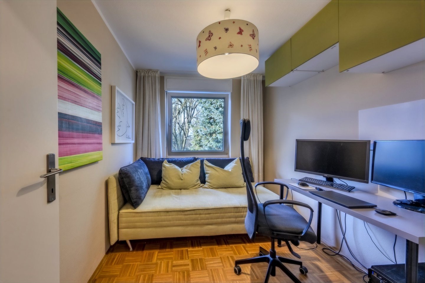 Ein weiterer Raum, aktuell als Büro genutzt, eröffnet flexible Nutzungsmöglichkeiten und lässt sich ebenso gut als Gästezimmer oder Rückzugsort gestalten. Ergänzt wird das Raumangebot durch einen großzügigen Flur mit integrierter Schranklösung, die praktischen Stauraum bietet und sich dezent in das Gesamtbild einfügt.
