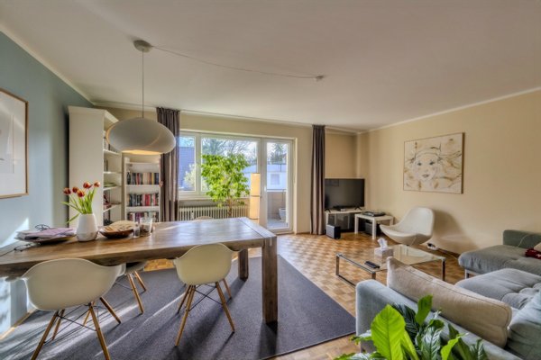 Der Wohnbereich bildet das Herzstück der Wohnung. Große Fenster sorgen für viel Tageslicht und schaffen eine freundliche, offene Stimmung. Von hier aus besteht Zugang zum Balkon, der einen geschützten Platz im Freien bietet und den Wohnraum auf angenehme Weise erweitert. Die grüne Umgebung trägt zusätzlich zu einem entspannten Wohngefühl bei.