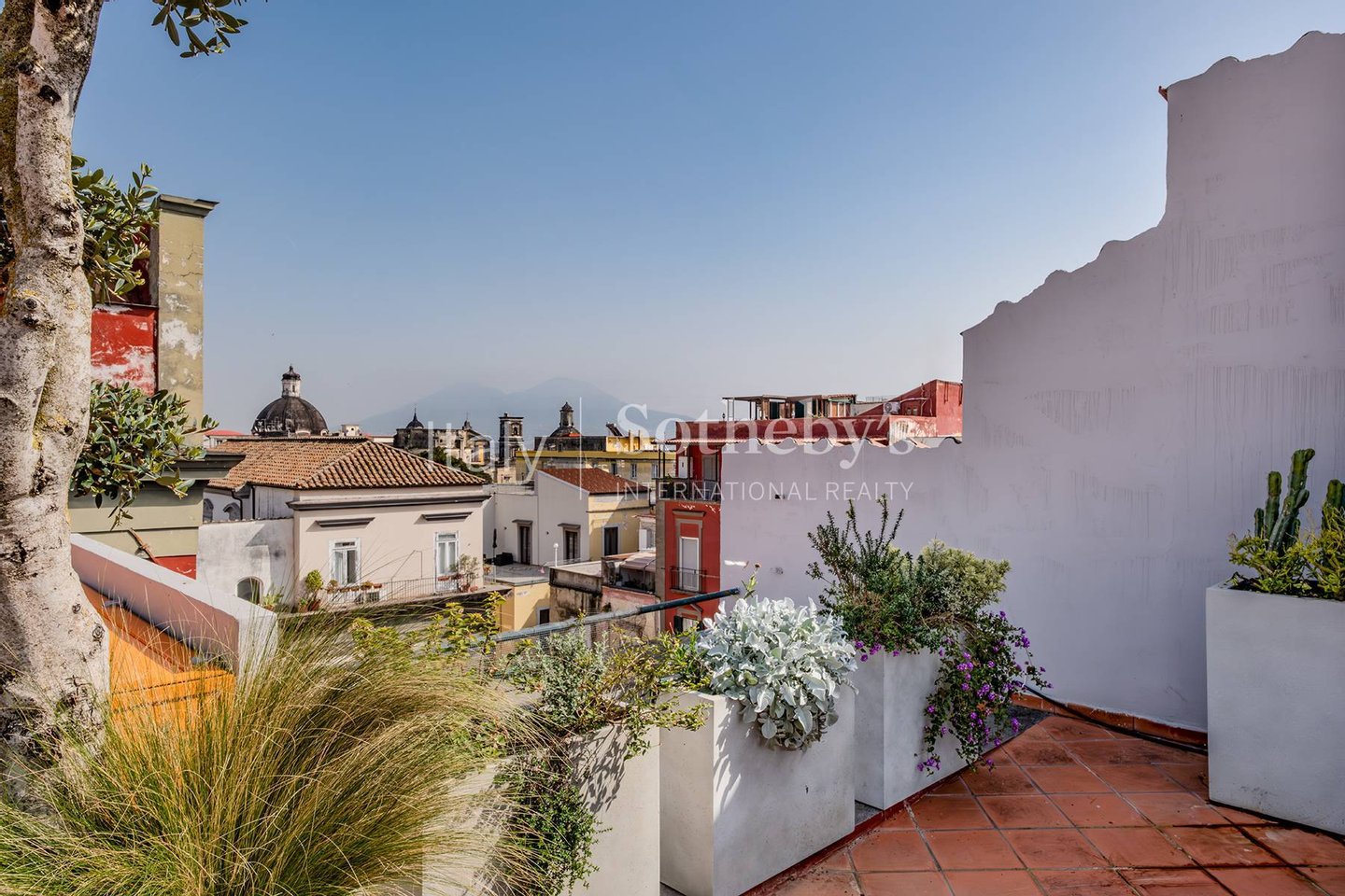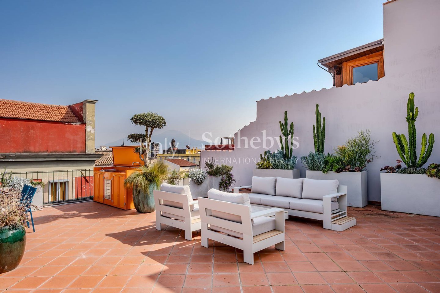 A distinctive feature is the panoramic terrace, internally connected by a staircase, furnished and equipped with an outdoor kitchen, a dining table, and a relaxation area with sofas. From here, the view opens onto Mount Vesuvius and the rooftops of Naples, offering a charming setting throughout the day.