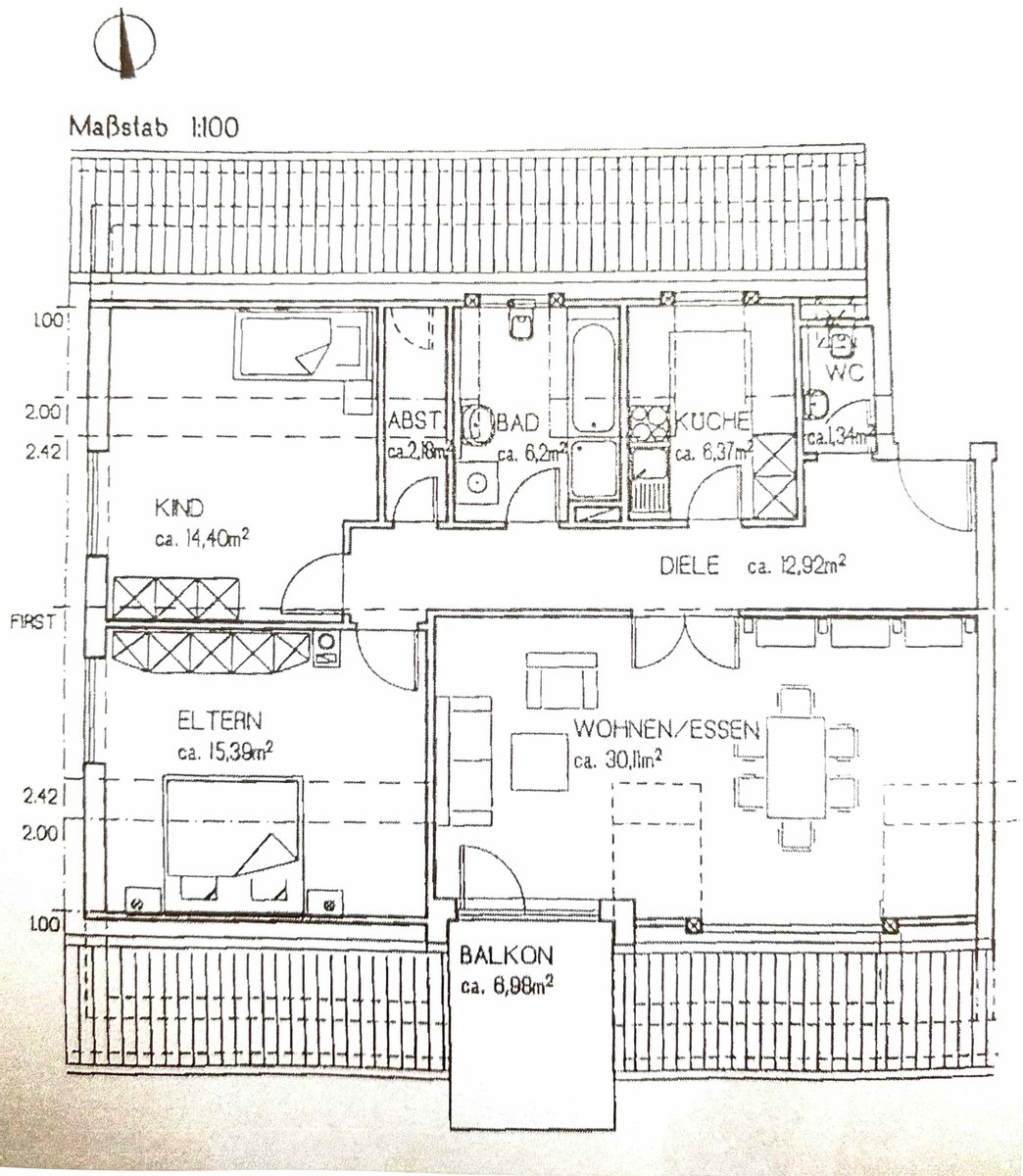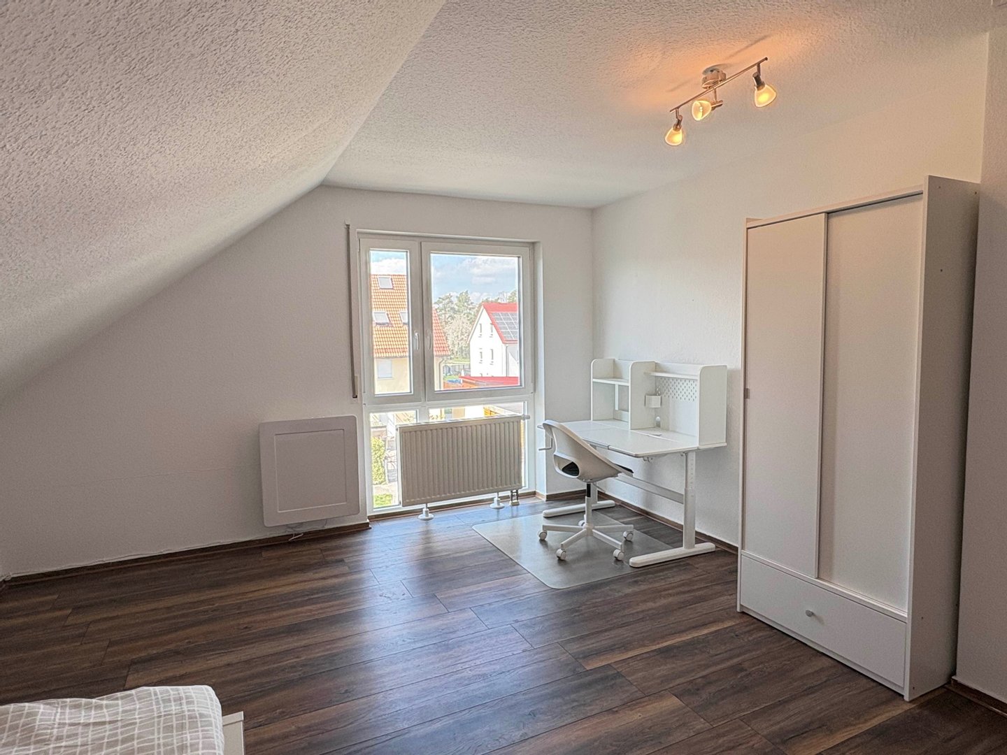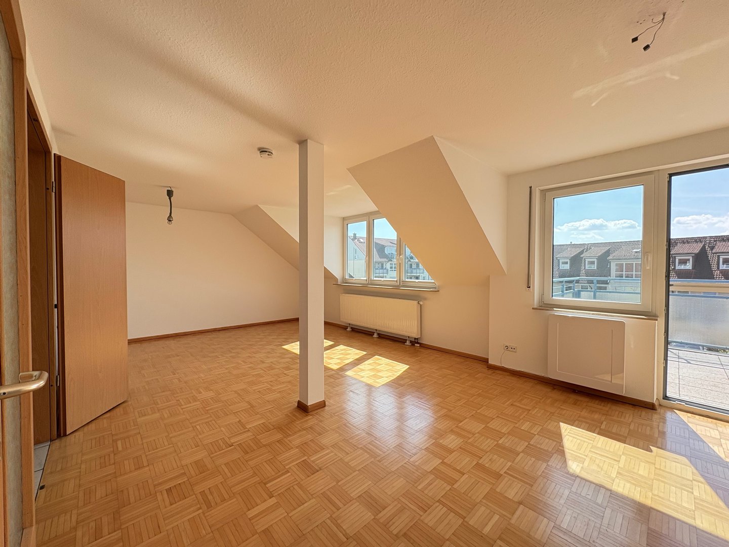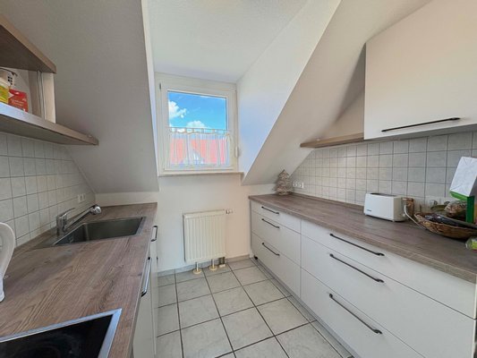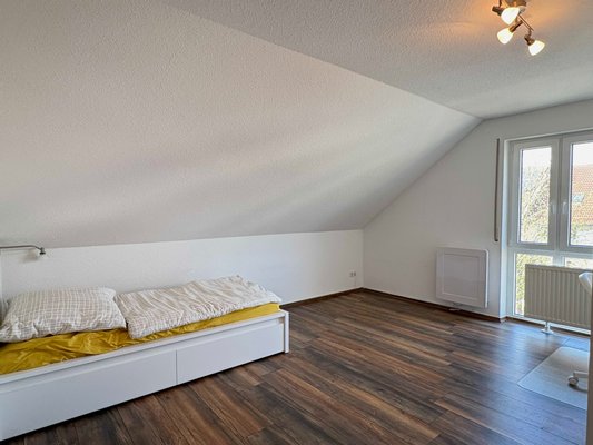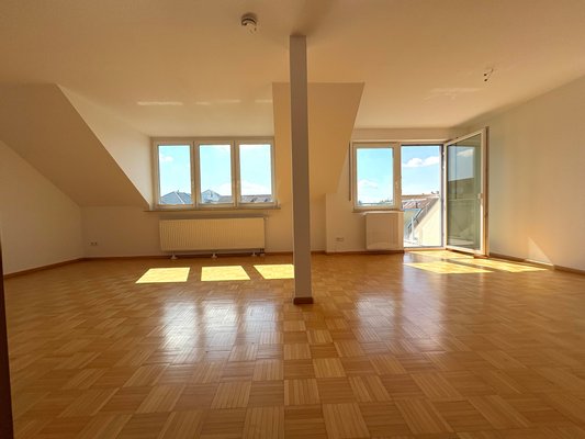 Die helle, geräumige Dachgeschosswohnung liegt im 2. Obergeschoss und bietet mit ihren 90 qm und 3 Zimmern genügend Raum für eine kleine Familie oder ein Paar, das ein Home-Office nutzen möchte. Hinzu kommt ein ca. 7 qm großer Balkon.