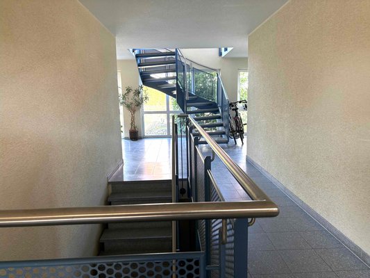 Schon beim Betreten des Treppenhauses mit großer Fensterfront überzeugt das hochwertige, zeitlose Design dieses Objektes.